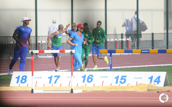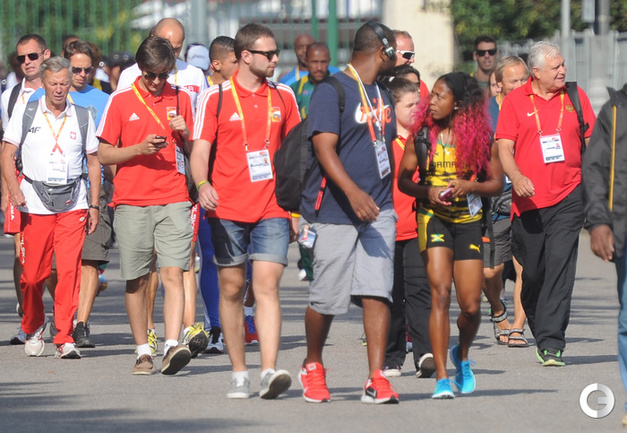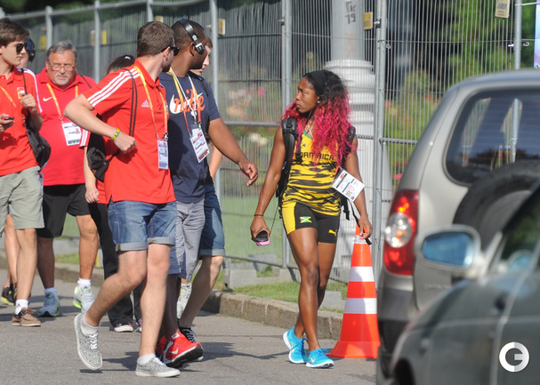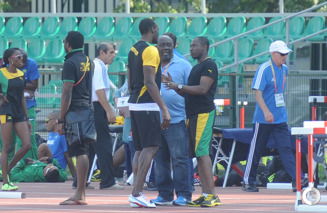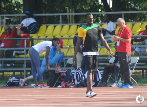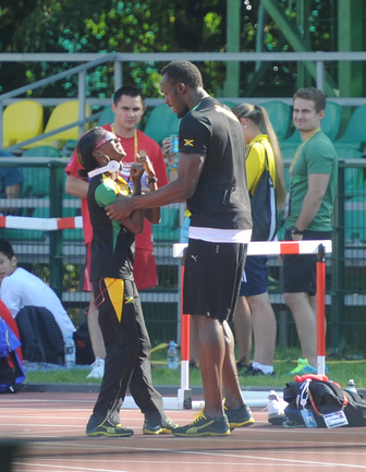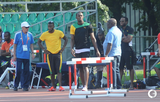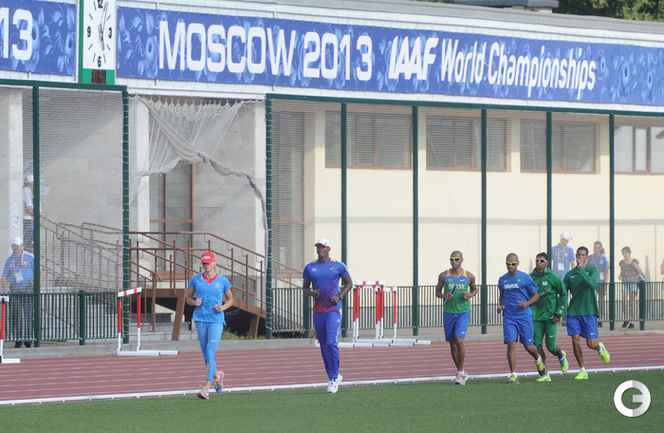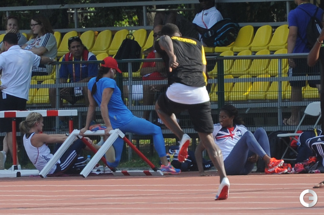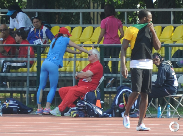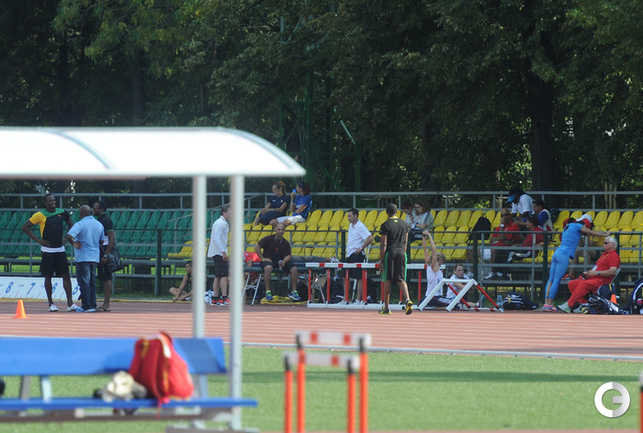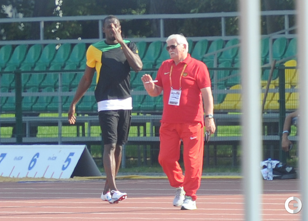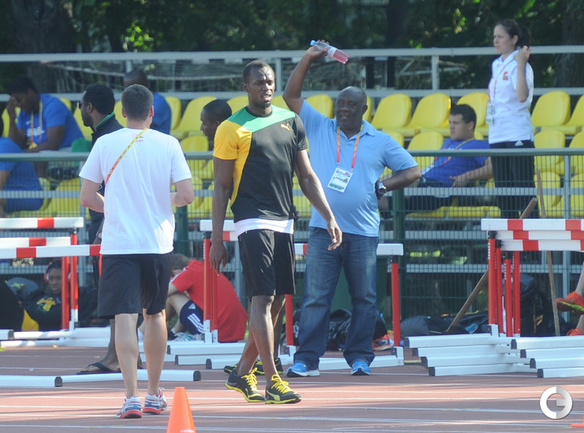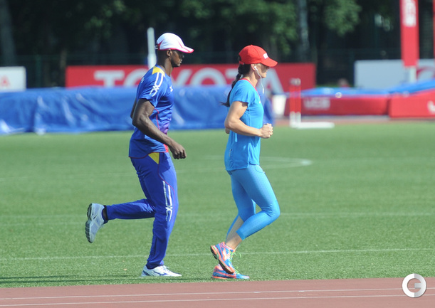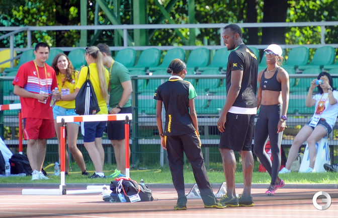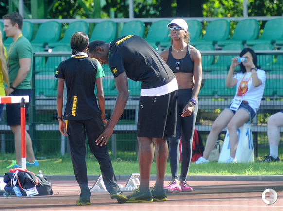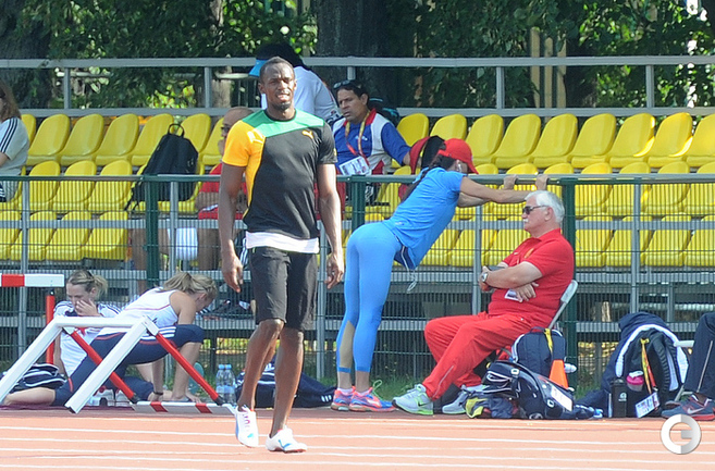 Москва. Лужники. Чемпионат мира. Легкая атлетика. Елена Исинбаева и Усейн Болт на тренировке. Фото - Федор УСПЕНСКИЙ, СЭ"