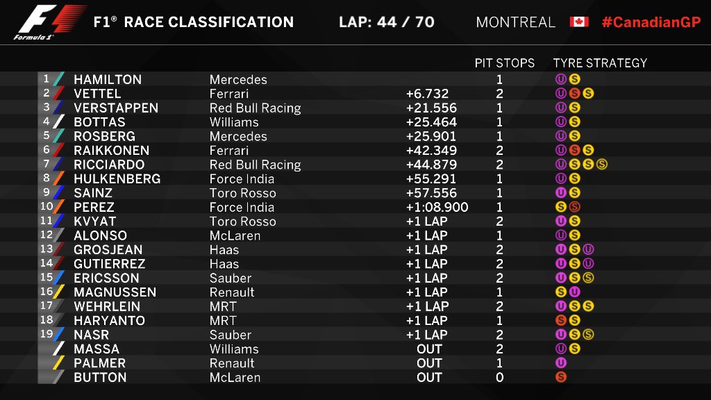 13-й круг: Из-за схода Баттона и двух пит-стопов Даниил Квят поднялся на 12-ю строчку. Лидирует Хэмилтон, Ферстаппен – второй.