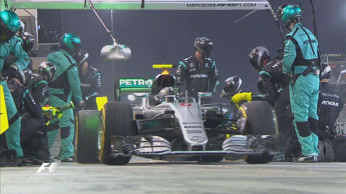 14-й круг. Вот, кстати, и Росберг отправляется в боксы. Все проходит быстро. И сразу же следом за ним на пит-стоп едет и Хэмилтон.