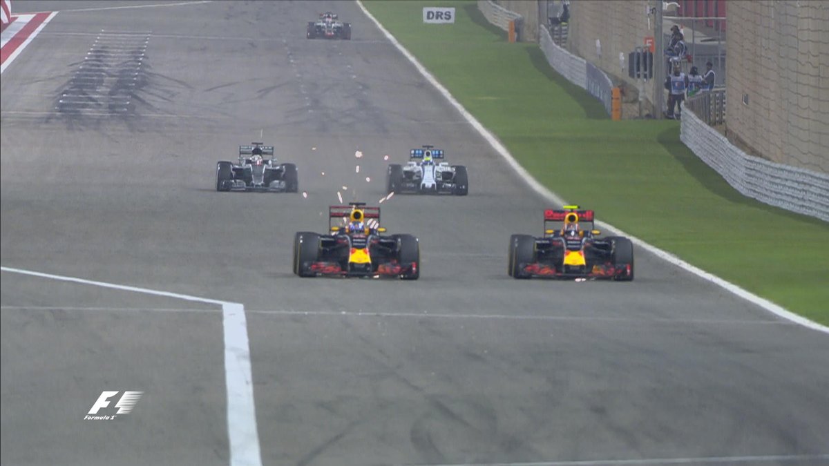 2-й круг. Лидирует Росберг, второй Масса. Палмер в итоге так и не стартовал, а у Переса отлетает переднее антикрыло. Ничего себе!