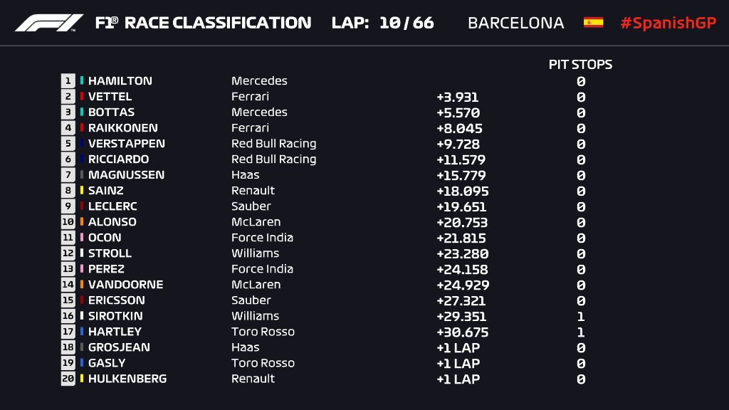 Очки сегодня также заработали Феттель, Риккьярдо, Магнуссен, Сайнс, Алонсо, Перес и Леклер. Сергей Сироткин финишировал последним из тех, кто прошел всю дистанцию. 14-е место у него.