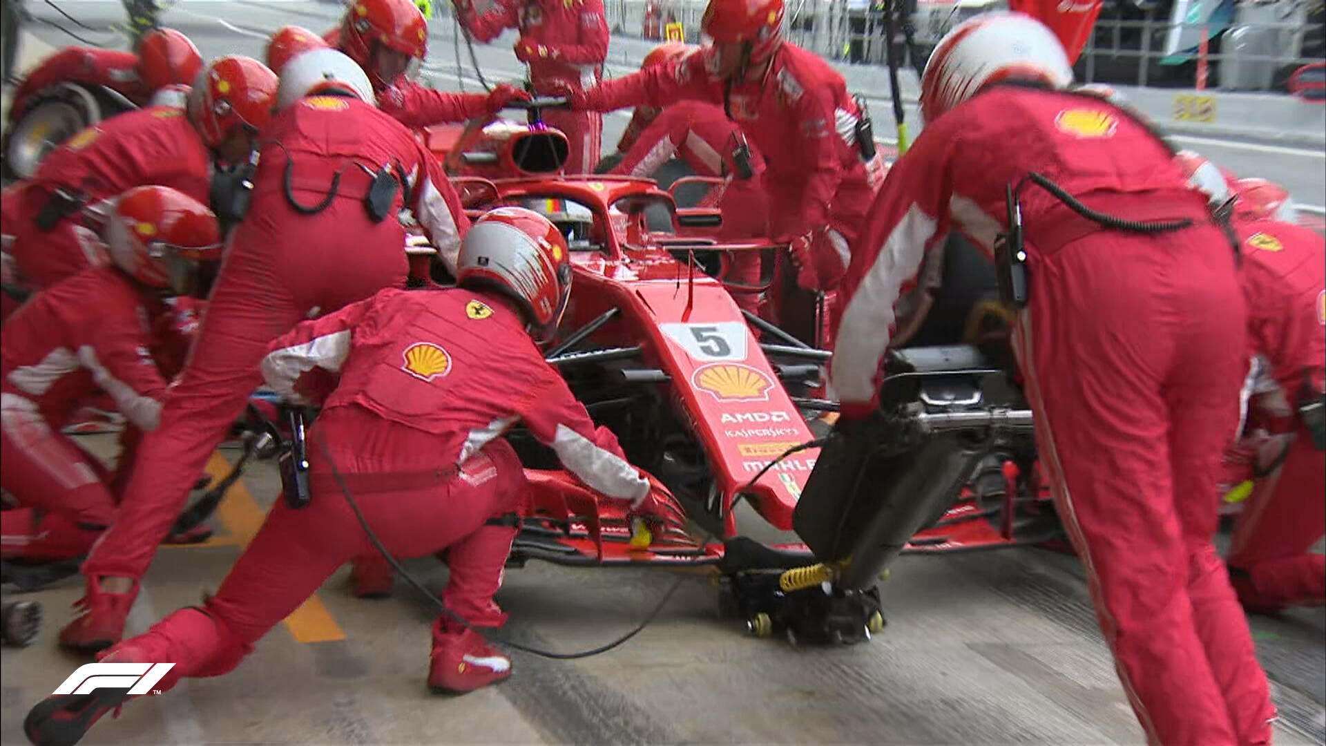19-й круг. Но тут же Феттель заехал в боксы, вот и первый пит-стоп, и делает его представитель "Феррари".