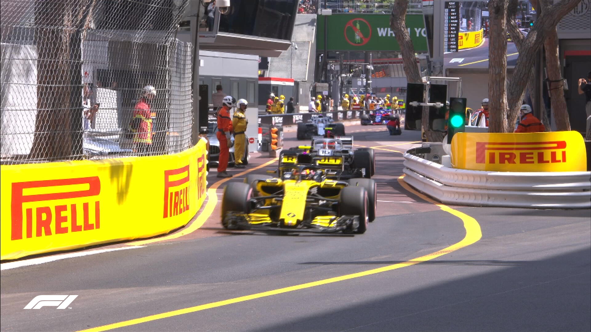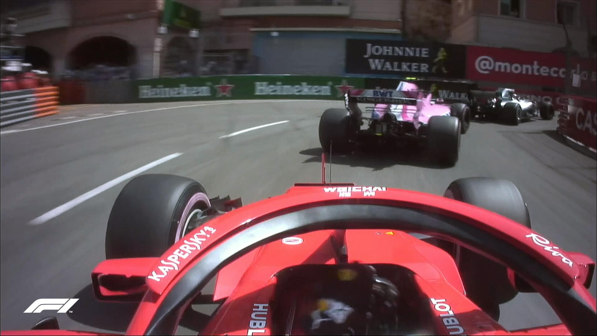 Райкконен (пока второй) пытается обойти время Риккьярдо, но ему помешал бодил "Мерседеса" (это был Боттас). Кими разразился грозной радиотирадой в адрес соотечественника.