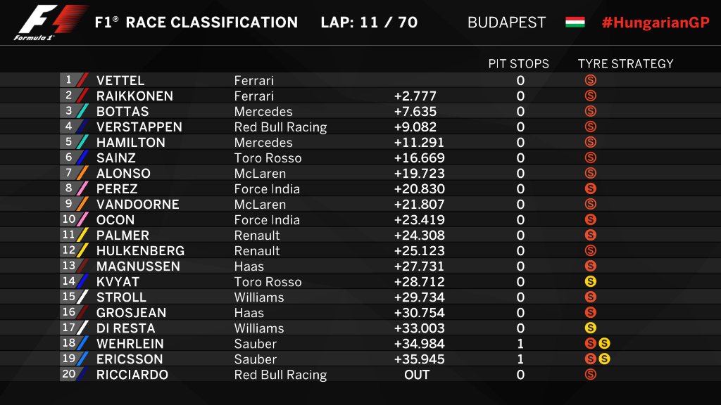 17-й круг. Топ-5 на данный момент: Феттель, Райкконен, Боттас, Ферстаппен, Хэмилтон.