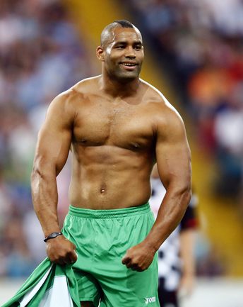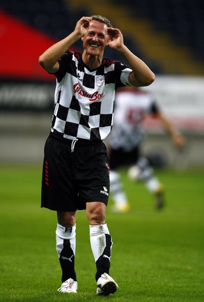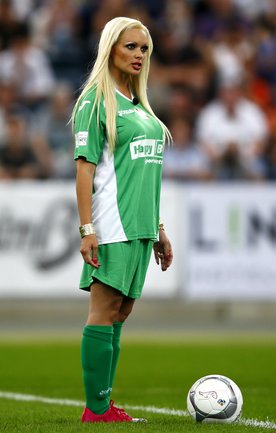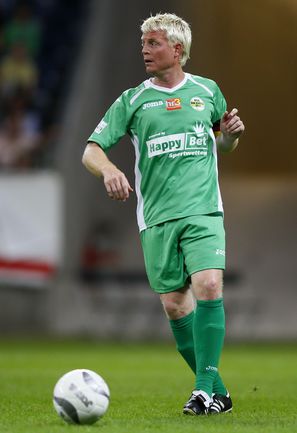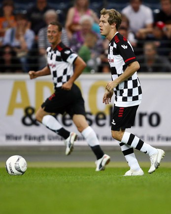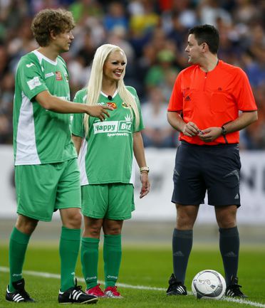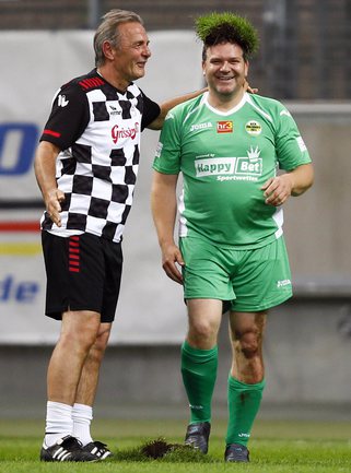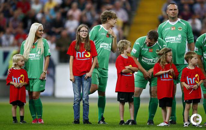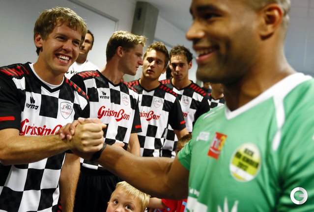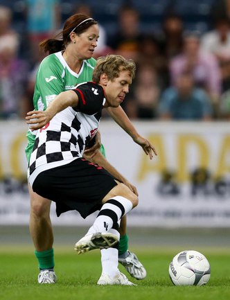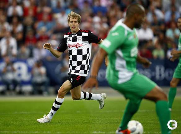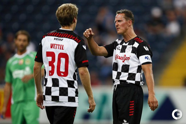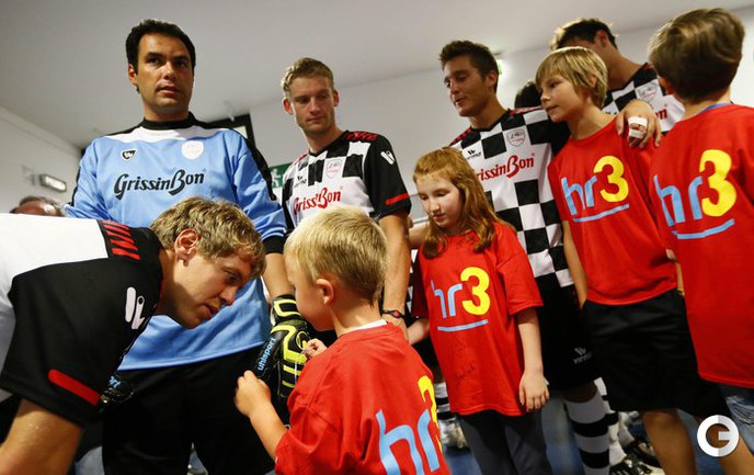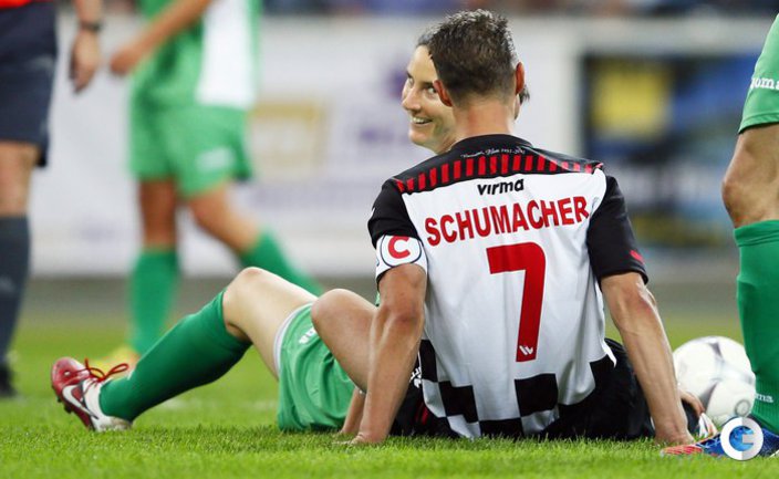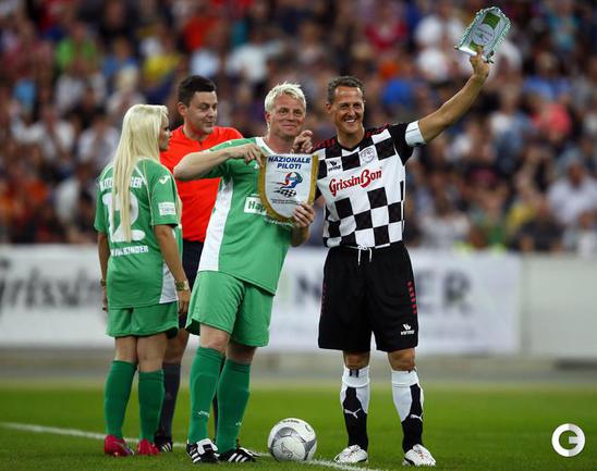 Во Франкфурте прошел благотворительный матч "Kick for Kids", в котором приняли участие и Михаэль Шумахер, Виталий Петров и другие автогонщики. Российский гонщик забил в игре гол и получил поздравления от именитого коллеги. Фото REUTERS