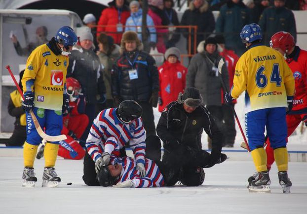 Вскоре после неожиданного гола шведов, который забил Нильссон, игра была остановлена. Главный арбитр встречи Юха-Матти Каниайнен на ровном месте рухнул на лед недалеко от скамейки россиян, а подъехавшие хоккеисты сразу дали понять, что случилась беда. В выехавшую на лед карету "Скорой помощи" финского рефери внесли на носилках, а неестественно вывернутое колено говорило о серьезной травме. Как тут не вспомнить соотечественника Каниайнена – Петри Кууселу, в финале чемпионата мира-2013 столкнувшегося с Евгением Иванушкиным и оказавшегося на льду без сознания с разбитым в кровь носом?