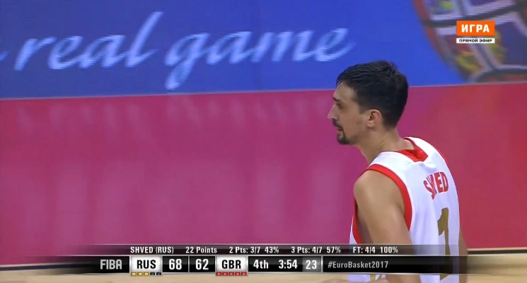И все! Первая половина завершается со счетом 43:31 в пользу сборной России. Самый результативный у нас - Алексей Швед (13 очков), Воронцевич набрал 9, Фридзон - 7.