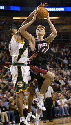Форвард "Юты" Андрей Кириленко реализовал два решающих броска в овертайме, и его команда во второй раз за последние сутки переиграла "Сиэтл", на этот раз в гостях - 93:92. Сначала россиянин за 1 минуту 28 секунд до конца дополнительного времени сделал точный трехочковый бросок с самого угла площадки, доведя счет до 91:89 в пользу "Джазменов". Затем, уже за 9 секунд до финальной сирены, Андрей сделал подбор в нападении, и сам же заработал еще 2 очка - 93:89, и даже точный трехочковый бросок хозяевам не помог. Всего на счету Кириленко в этом матче 22 набранных очка, а игру "Суперсоникс" вел лидер Рэй Аллен, набравший 40 очков. |
