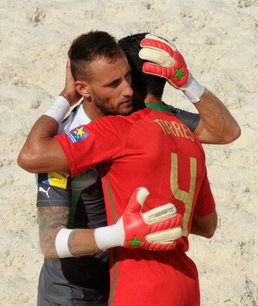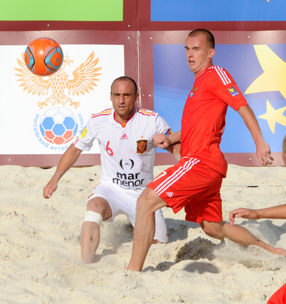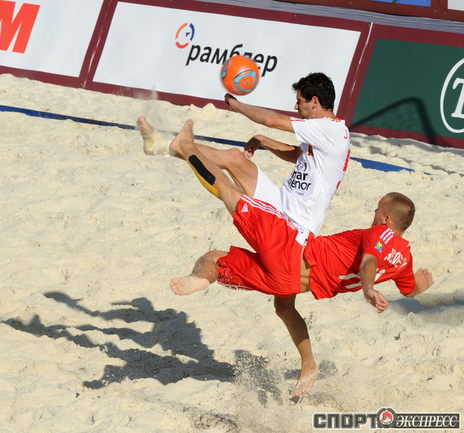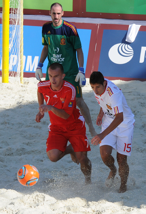 Пляжный футбол. Москва. Евролига. Суперфинал. Групповой этап. 2-й тур. Россия - Испания - 4:2 (1:1,2:0, 1:1). Голы: Шишин, 6 (1:0), Хорхе, 12 (1:1), Хуанма - автогол, 13 (2:1), Макаров, 18 (3:1). Хорхе, 35 (3:2). Шишин, 36 (4:2). Группа В. Второй тур. Португалия — Италия — 3:1 (2:0, 0:0, 1:1). Голы: Маджер, Бельчиор (2) — Легисса Фото - Никиты УСПЕНСКОГО, "СЭ"