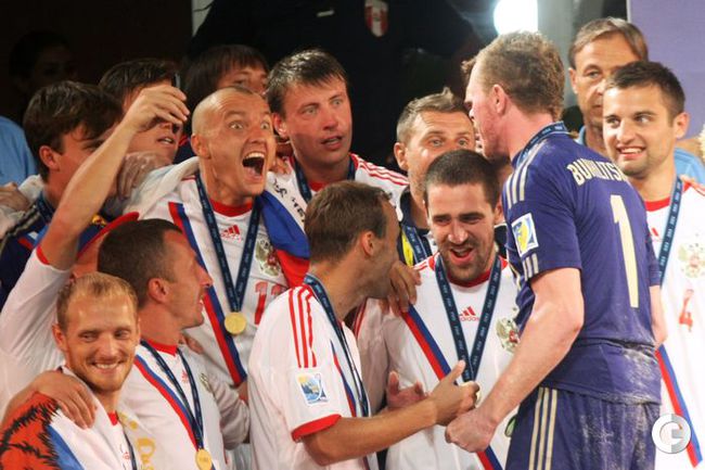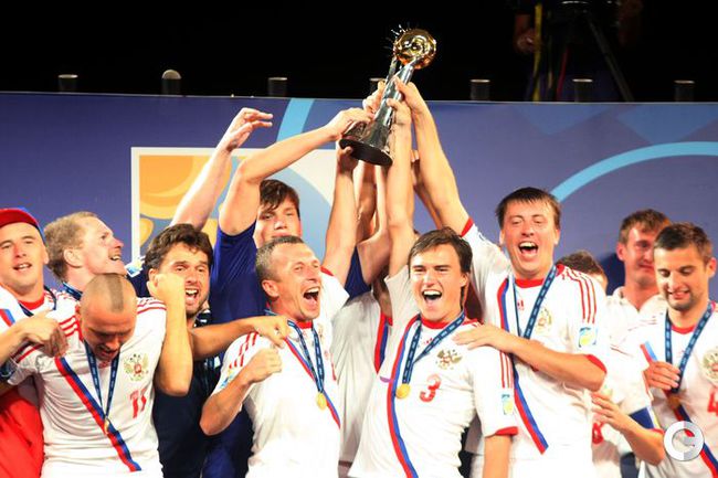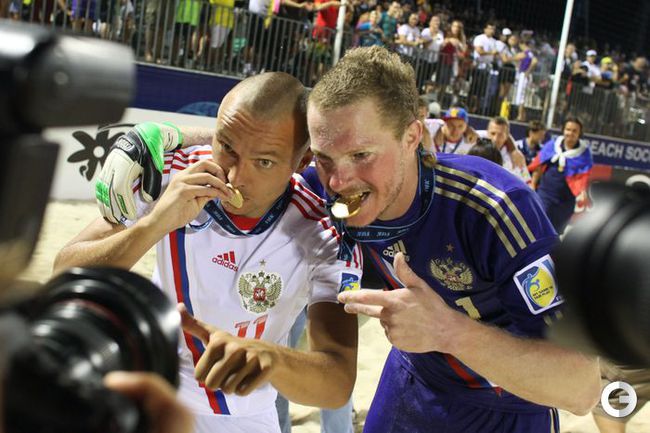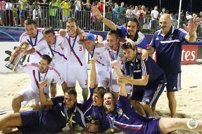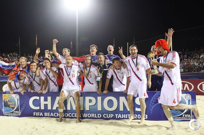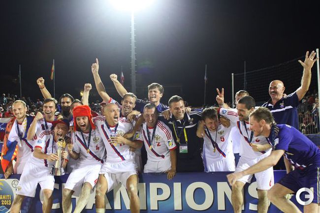 Сборная России по пляжному футболу защитила титул чемпиона мира, завоеванный два года назад. В решающем поединке ЧМ-2013, проходящего на Таити, россияне одолели Испанию - 5:1. Фото AFP