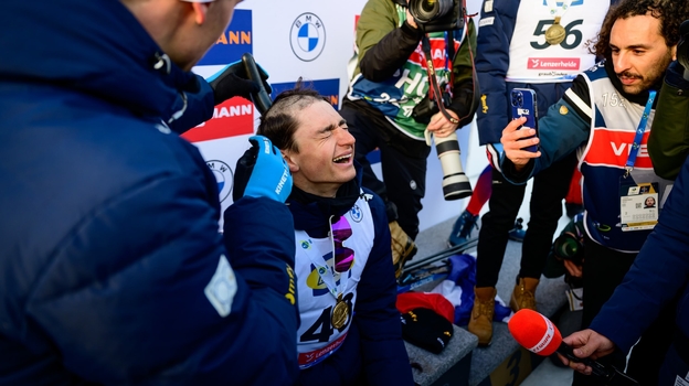 Французского биатлониста Эрика Перро побрили налысо после победы в индивидуальной гонке на чемпионате мира в швейцарском Ленцерхайде.