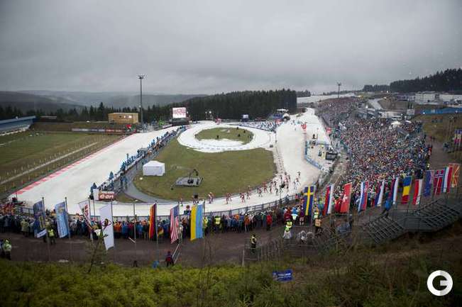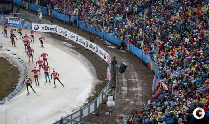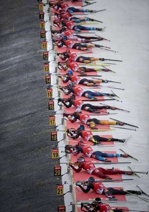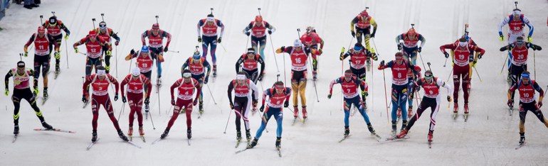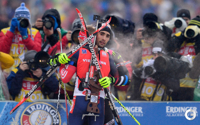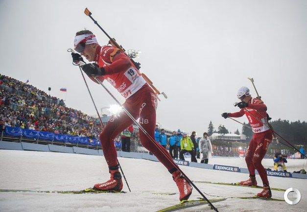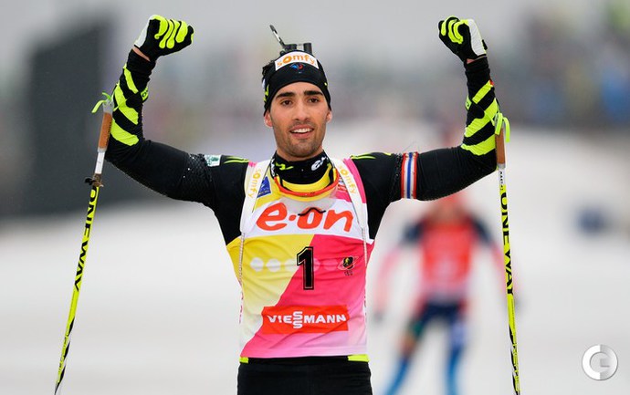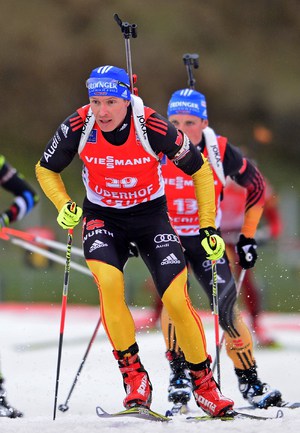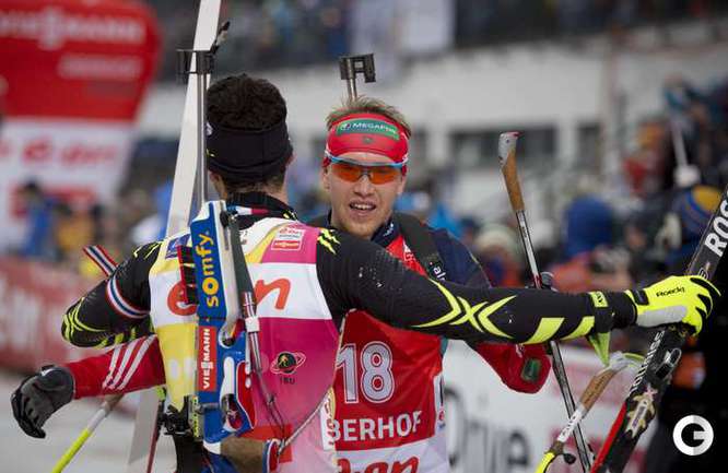 Оберхоф (Германия). Кубок мира. Четвертый этап. Мужчины. Масс-старт. 15 км. 1. М. Фуркад (Франция) - 37.39,4 (1 шт. круг). 2. А-й ВОЛКОВ (Россия) - отставание 5,2 (0). 3. Т. Бе (Норвегия) - 19,0 (2). Фото AFP