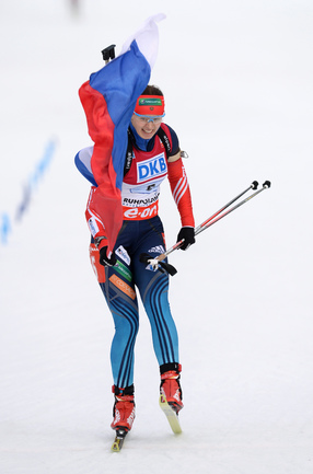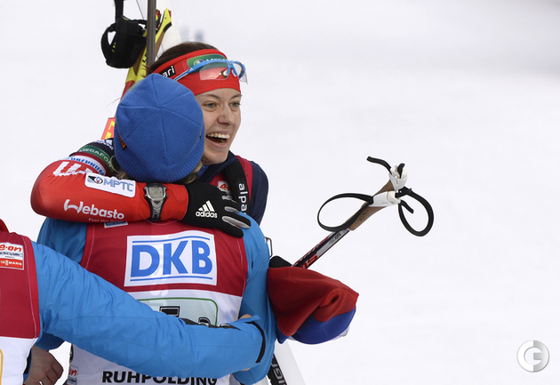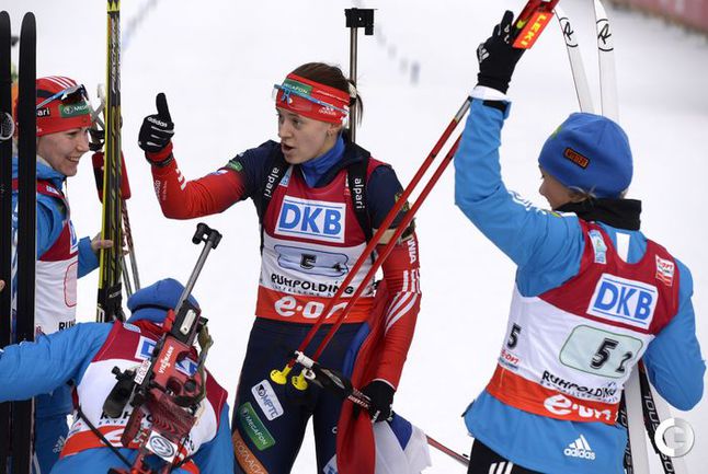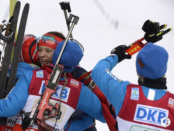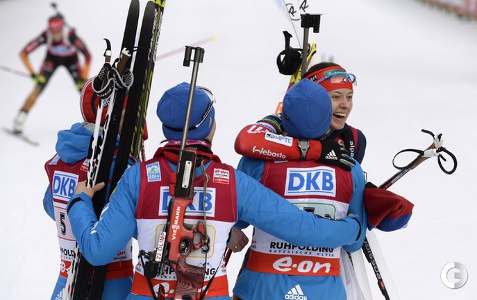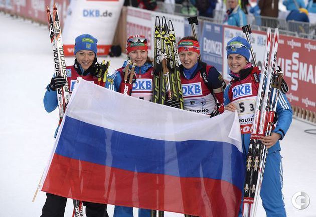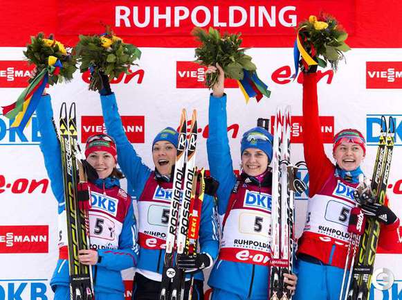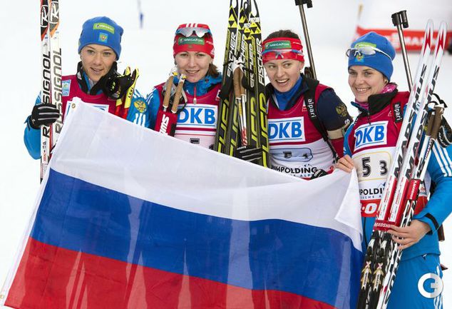 Женская сборная России заняла первое место в эстафете на этапе Кубка мира в Рупольдинге. Четверка в составе Екатерины Глазыриной, Ольги Зайцевой, Ирины Старых и Ольги Вилухиной опередила Германию на 6,2 секунды. Фото AFP