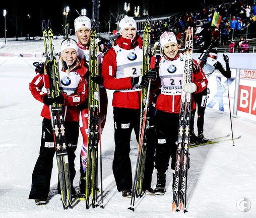 Эстерсунд (Швеция). Кубок мира. 1-й этап. Смешанная эстафета 2х6 + 2х7,5 км. 1. Франция (Бескон, А. Шевалье, С. Фуркад, М. Фуркад) - 01:15.05,5 (0 шт. кругов + 11 доп. патронов). 2. Норвегия (Солемдаль, Т. Экхофф, Кристиансен, Биркеланн) - отставание 0,1 (1+11). 3. Германия (Ф. Хильдебранд, Пройсс, Пайффер, Шемп) - 0,2 (0+9)... 2. РОССИЯ (Глазырина, Романова, Гараничев, Лапшин) - 57,7 (0+13). Фото AFP