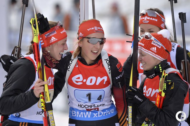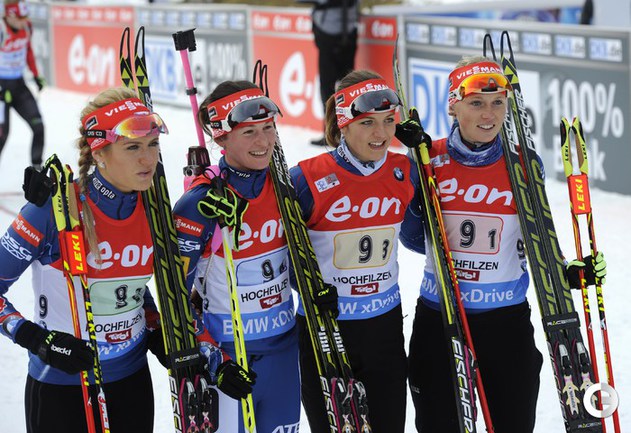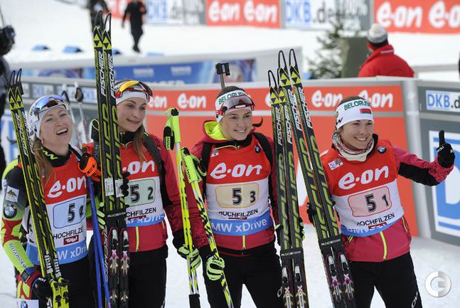 Женская сборная России в составе Яны Романовой, Ольги Подчуфаровой, Екатерины Шумиловой и Екатерины Глазыриной заняла восьмое место в эстафете на втором этапе Кубка мира в австрийском Хохфильцене. Первое место заняла сборная Германии. Второй стала команда из Белоруссии. Тройку лидеров замкнула Чехия. Фото AFP