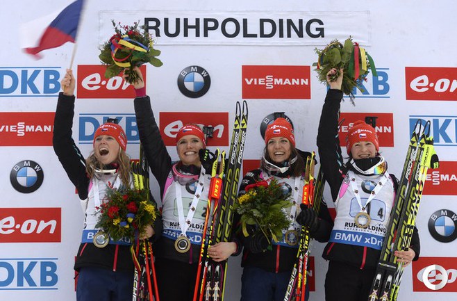 Биатлон. Рупольдинг. Кубок мира. Женщины. Эстафета. 4 х 6 км. 1. Чехия (Пускарчикова, Соукалова, Ландова, Виткова) – 1:23.57,7 (0 штрафных кругов + 9 доп. патронов). 2. Белоруссия (Скардино, Кривко, Писарева, Домрачева) – отставание 1.13,3 (0+6). 3. Германия (Пройс, Ф. Хильдебранд, Хинц, Дальмайер) – 1.39,3 (1+6)... 8. РОССИЯ (Романова, Виролайнен, Шумилова, Нечкасова) – 4.36,5 (2+13). Фото AFP