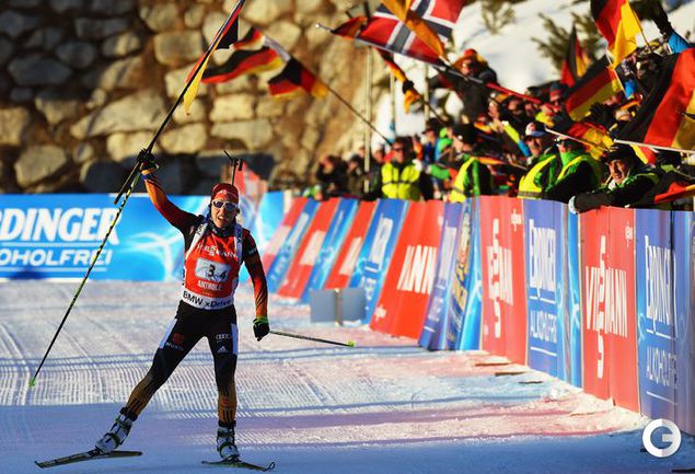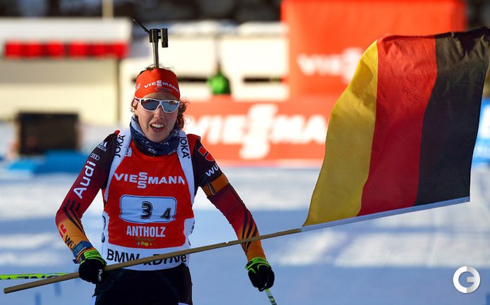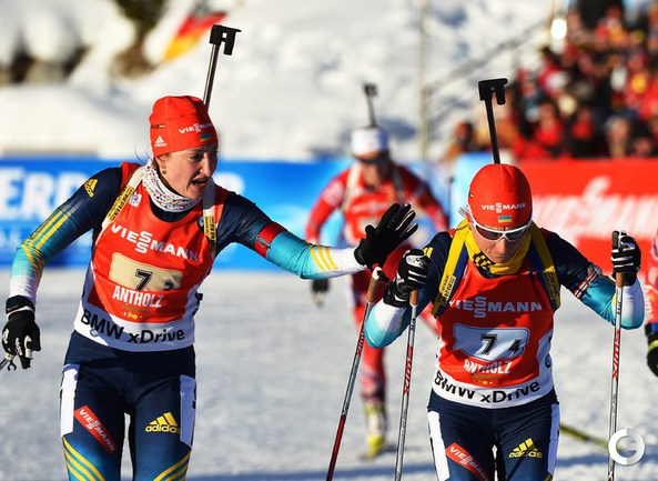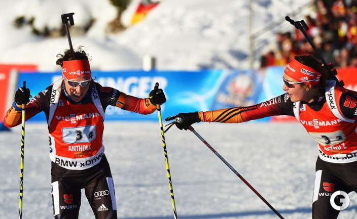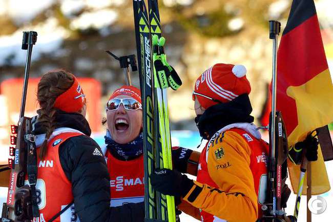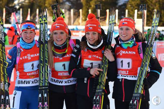 Антерсельва (Италия). Кубок мира. Женщины. Эстафета. 4 х 6 км. 1. Германия (Ф. Хильдебранд, Пройсс, Кюммер, Дальмайер). 2. Чехия (Пускарчикова, Соукалова, Ландова, Виткова). 3. Украина (Джима, Бурдыга, Абрамова, Вал. Семеренко). 4. РОССИЯ (РОМАНОВА, ВИРОЛАЙНЕН, ШУМИЛОВА, ГЛАЗЫРИНА). Фото AFP