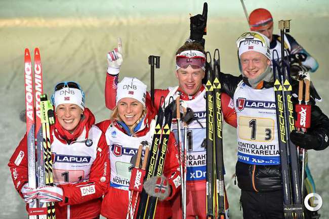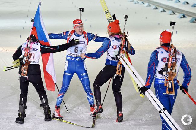 Контиолахти (Финляндия). Чемпионат мира. Смешанная эстафета. 2 х 6 + 2 х 7,5 км. 1. Чехия (Виткова, Соукалова, Шлезингер, Моравец) – 01:20.27,2 (0 шт. кругов + 8 доп. патронов). 2. Франция (Бескон, Дорен-Абер, Беатрикс, М. Фуркад) – отставание 20,2 (0 + 8). 3. Норвегия (Хорн, Т. Экхофф, Й. Бе, Т. Бе) – 27,7 (1 + 3). Фото AFP, REUTERS