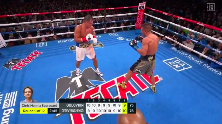 Девятый раунд. Головкин старается в начале и в концовке раунда действовать активнее. Попаданий у него точно меньше, чем у соперника, но визуальных сделов активности Деревянченко практически не видно.