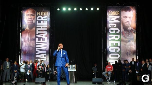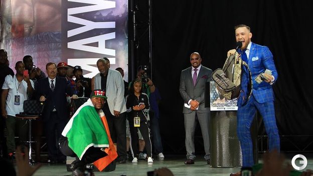 В Торонто состоялась вторая пресс-конференция в преддверии боя Флойда Мейуэзера и Конора Макгрегора в преддверии назначенного на 26 августа поединка в Лас-Вегасе. Бойцы вновь решили устроить из нее безумное шоу. Во время дуэли взглядов Мейуэзер решил спародировать энергичные движения Макгрегора. Мейуэзер в одном из эпизодов внезапно достал флаг Ирландии и накинул его на плечи. Макгрегор предупредил оппонента, что убьет его, если тот что-то сделает с флагом.
