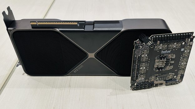 Основная плата устройства тоже стала более компактной — на ней установлен чип GB202 с 32 Гб памяти GDDR7. Для питания используется разъем 12V-2x6 с пропускной способностью до 600 Вт, а 30-фазная система подачи энергии обеспечит стабильную работу даже при больших нагрузках.