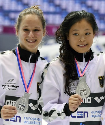 Берлин. Чемпионат Европы. Синхронные прыжки в воду. Женщины. 1. ПЕТУХОВА / ТИМОШИНИНА (Россия) – 314,70. 2. Курьо / Фань (Германия) – 290,01. 3. Кормош / Рейзингер (Венгрия) – 279,48. Фото AFP