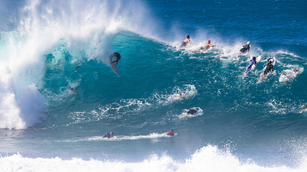 В это же время на другом конце света собрались любители прокатиться на доске в Тихом океане. Серфингистов привлекают огромные волны, которые накатывают на берега Гавайских островах в январе.