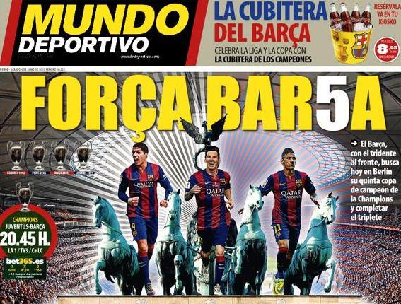 Пожалуй, самую оригинальную обложку предложила газета Mundo Deportivo. Несравненная тройка МСН – Месси, Суарес, Неймар – бежит за пятым трофеем в истории "Барселоны", а за спиной у нее, как будто отставая, четверка коней со знаменитых Бранденбургских ворот в Берлине.