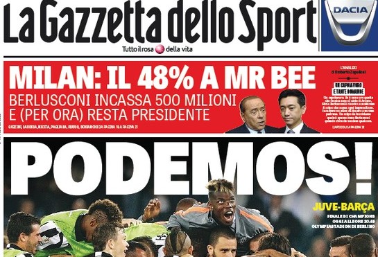 Ведущая спортивная газета Италии La Gazzetta dello Sport вышла с "шапкой" "Podemos!", что в переводе с испанского означает: "Можем!" На предмет исхода предстоящего финала издание опросило 11 футболистов разных национальностей, ранее выступавших за "Ювентус": француз Дешам, поляк Бонек, хорват Тудор, валлиец Раш… В основном они сходятся на том, что судьба матча зависит от того, сумеет ли "Ювентус" перекрыть кислород неугомонной южноамериканской троице.