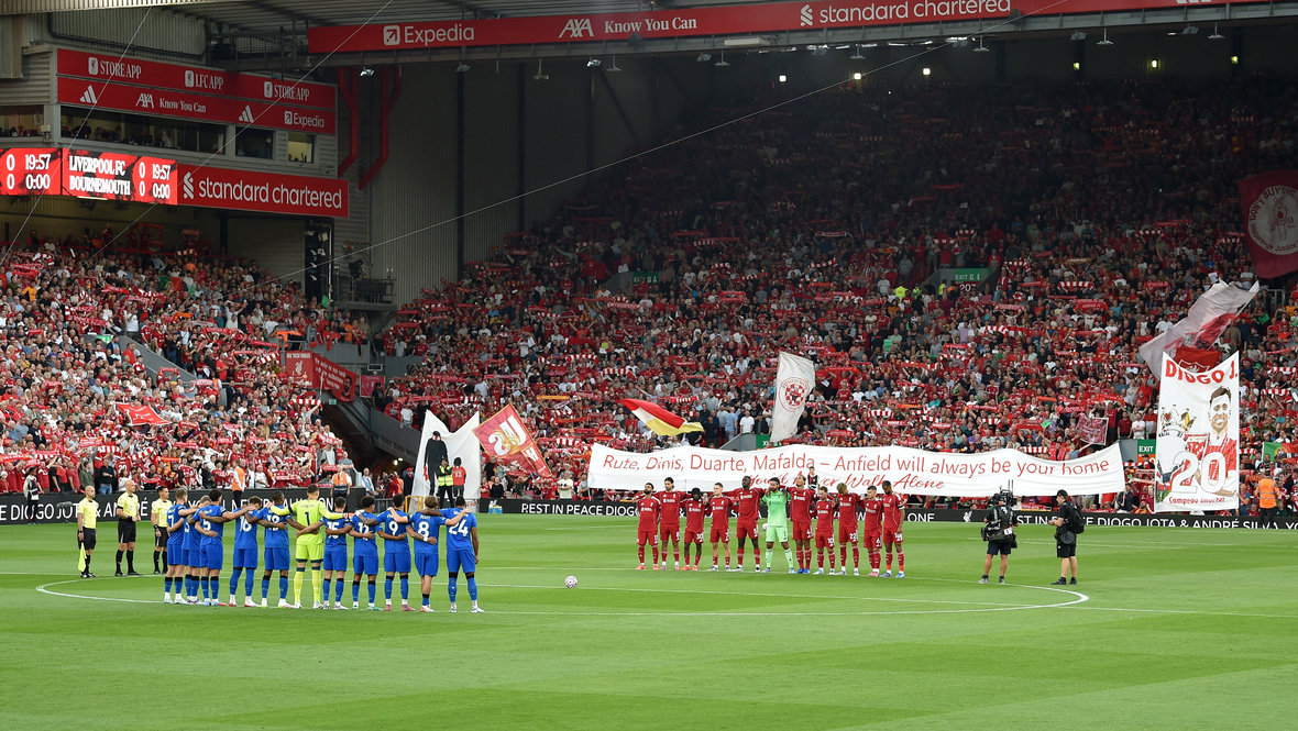 Фанаты действительно подготовились — перед стартовым свистком на одной из трибун появились огромные инициалы Жоты и 20-й номер, под которым он играл.