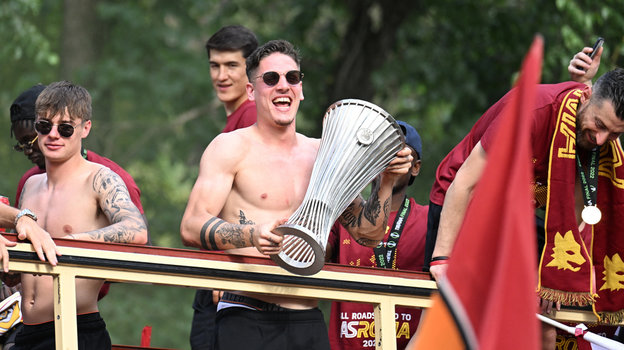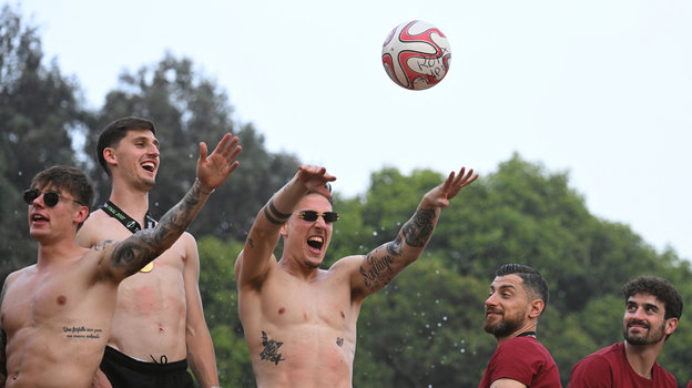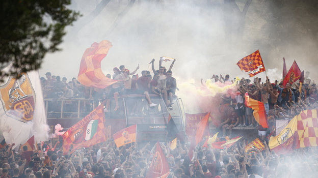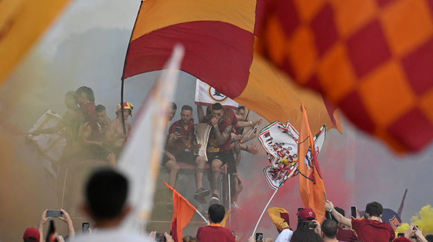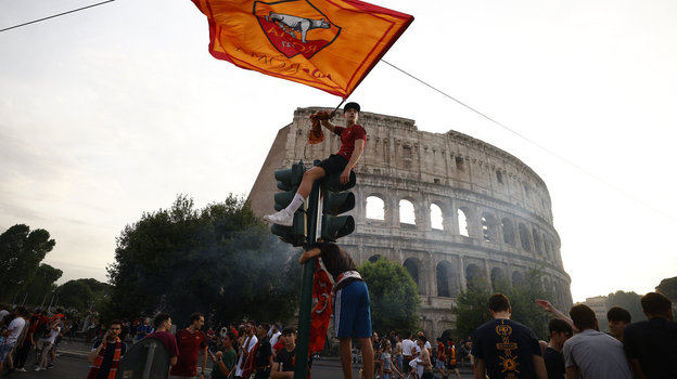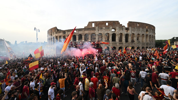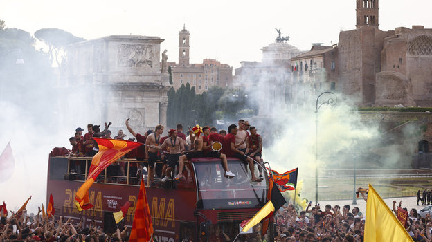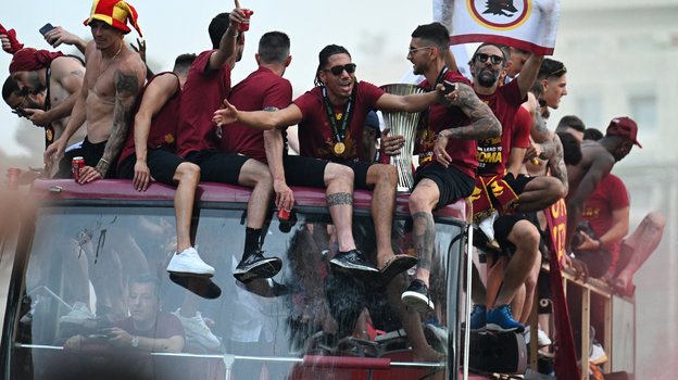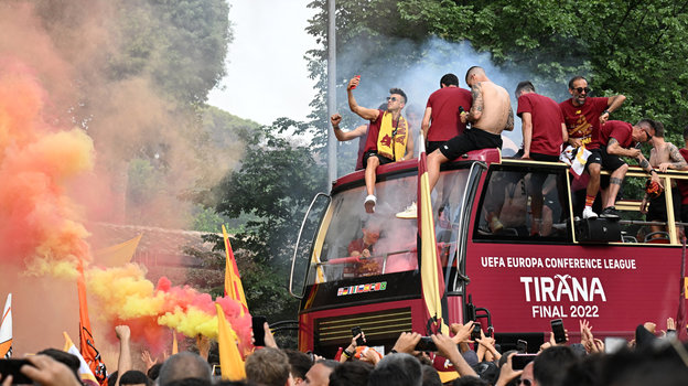 В четверг вечером игроки «Ромы», победившие накануне «Фейеноорд» в финале Лиги конференций, проехались по столице Италии, где их приветсвовали многочисленные болельщики. Историческую часть древнего города заволокло дымом от пиротехники фанатов. Точно так же, как и ночью накануне.