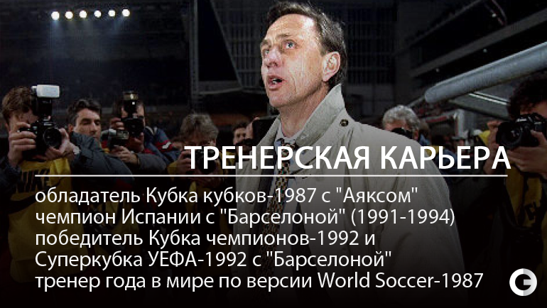 Он ведь ещё и создатель современной Барсы. Вот уже предлагают назвать в его честь Камп Ноу. Ну и создатель Аякса, разумеется. Вообще редчайший случай: гений и как игрок и как тренер. Светлая память...