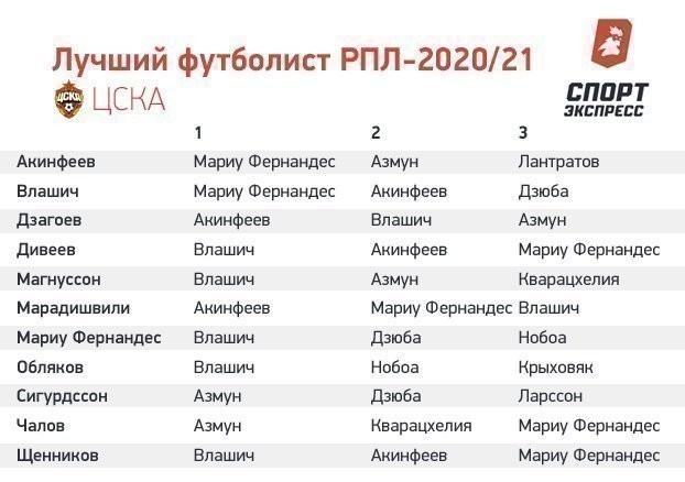 Футболисты ЦСКА отдали предпочтение полузащитнику Николе Влашичу в опросе футболистов клубов премьер-лиги, который ежегодно проводит «СЭ» для определения лучшего игрока чемпионата России. Второй по популярности у армейцев — вратарь Игорь Акинфеев, а в тройке — защитник Мариу Фернандес и форвард «Зенита» Сердар Азмун.