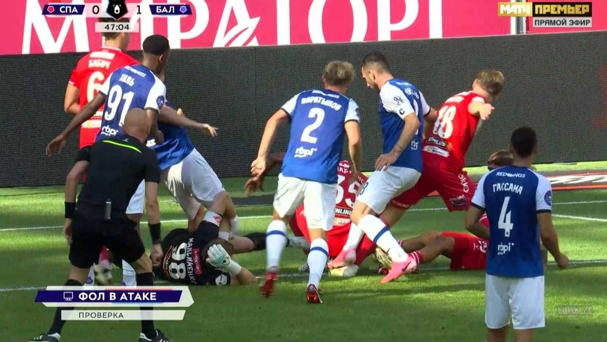 На 44-й минуте матча 2-го тура чемпионата России «Спартак» — «Балтика» судья Сергей Карасев не зафиксировал никаких нарушений правил, когда у линии площади ворот красно-белых шла борьба за мяч, после чего гости открыли счет. Затем в действия рефери вмешались его видеоассистенты Виталий Мешков и Вера Опейкина, и арбитр, посмотрев повторы, на 45+3-й минуте объявил, что калининградец Николай Титков нарушил правила (выходит, что еще до того, как мяч выткнул Андрей Мендель). В итоге гол не был засчитан.