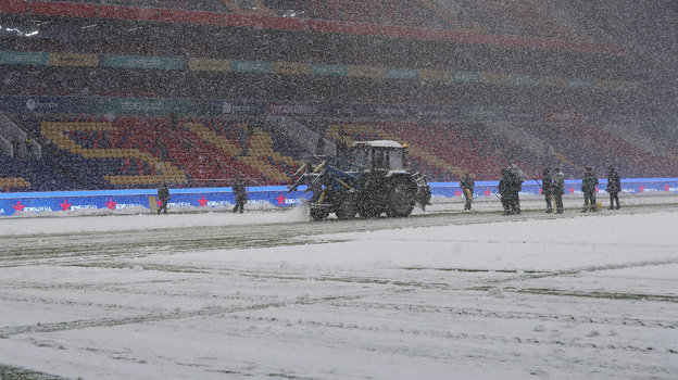 9-я минута. Пока футболисты бегают на поле, снег не прекращается. И работники стадиона убирают его в режиме реального времени.