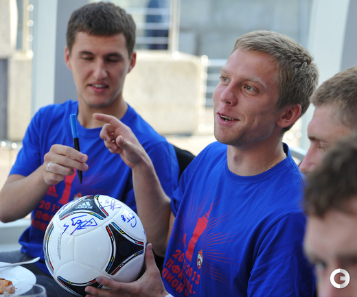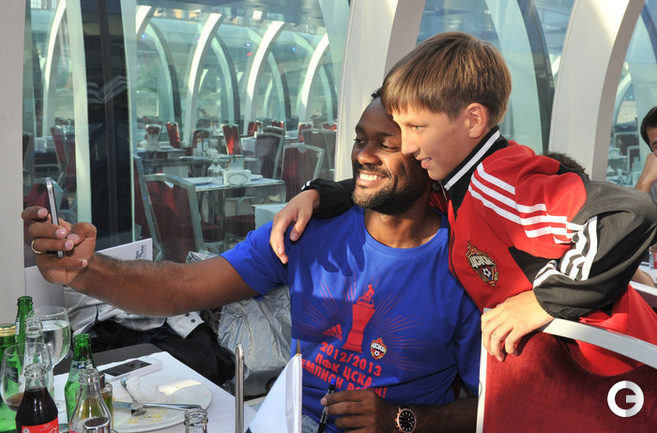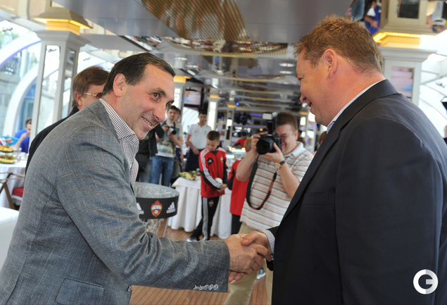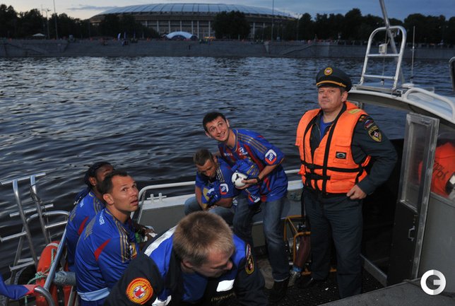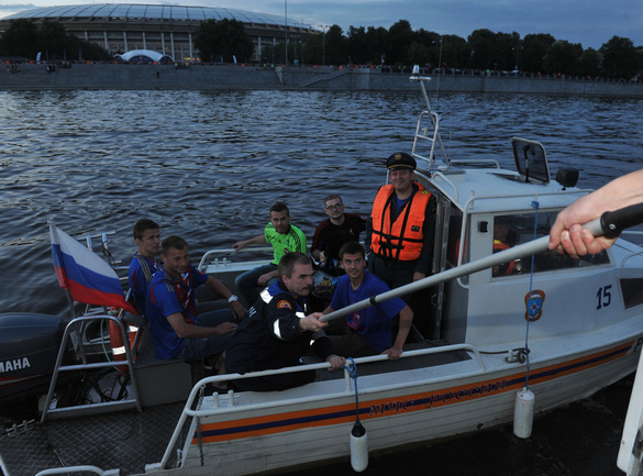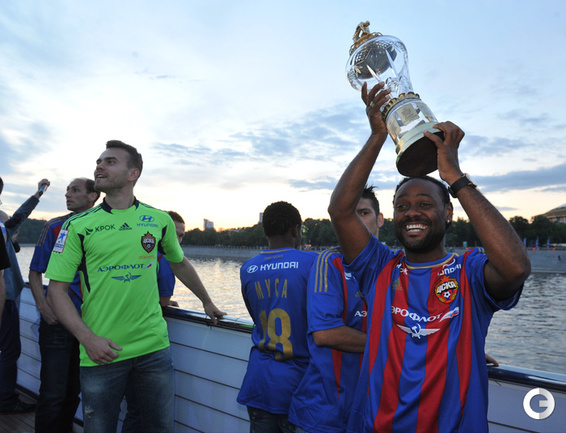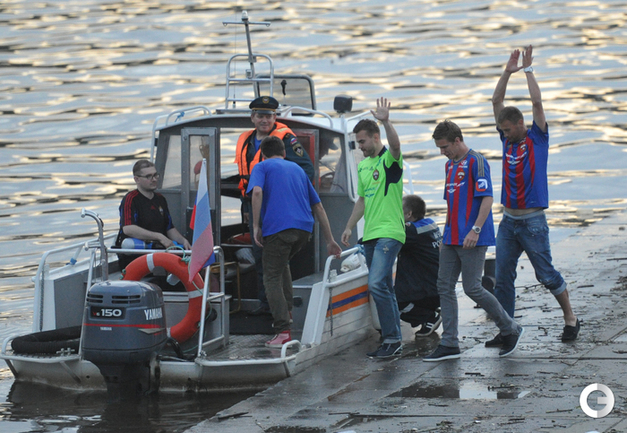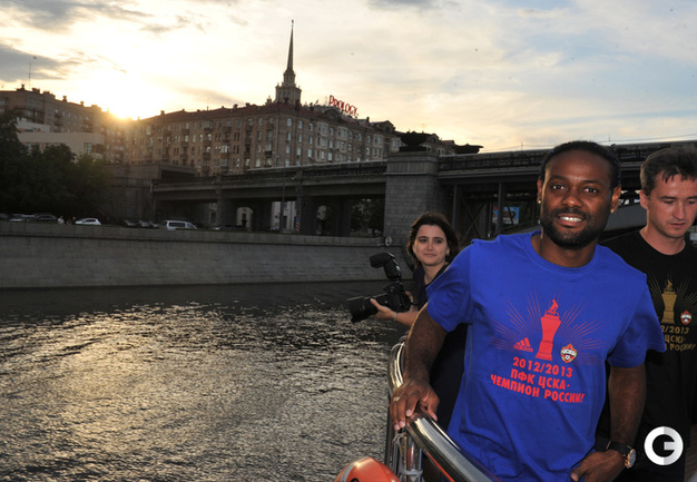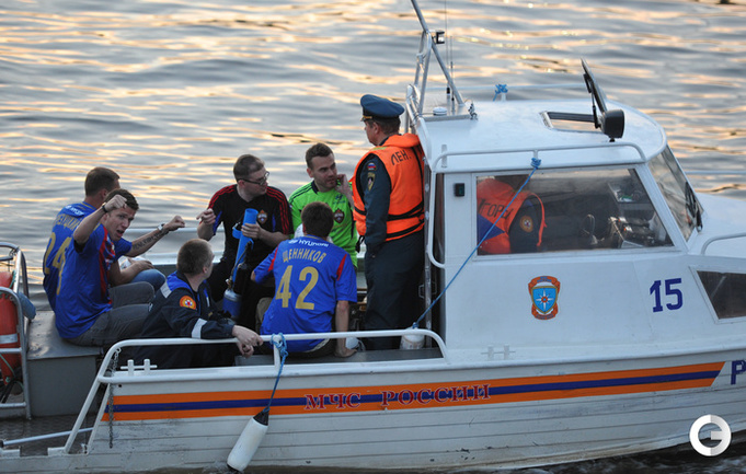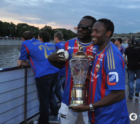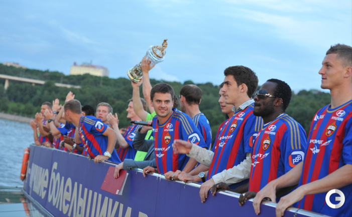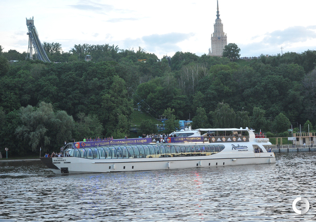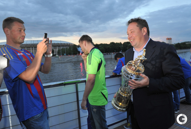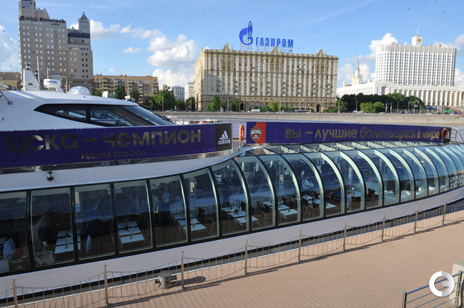 Новоиспеченные чемпионы России – игроки ЦСКА – вместе с чемпионским кубком отправились в плавание по Москве-реке на теплоходе. Фото Александра Федорова, Татьяны Дорогутиной, "СЭ"