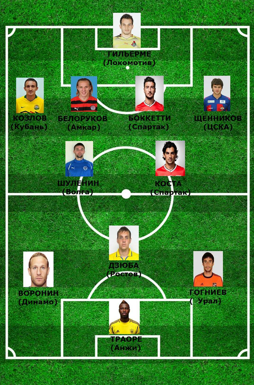 Ну, тут картина ясная: Гильерме - потому что пеналь потащил, Шуленин - первую банку занёс, Коста - потому что спартаковский новичёк, Щенников - потому что хоть кто-то должен быть из ЦСКА, Воронин - динамовский возвращенец, забил. Остальные вроде более-менее все по делу, хотя варианты тоже возможны. Стопроцентен ИМХО только Гогниев.