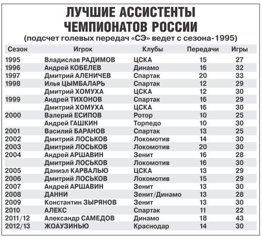 Лишний раз слабость российских бомбардиров доказывает ситуация с их же ассистентами. В среднем лучший по голевым передачам в нашей премьер-лиге отдает их примерно столько же, сколько и его коллега из Англии, Италии или Германии: порядка 12-13 за сезон. Хотя стабильностью чемпионат России явно не отличается. Выделяются сразу два провала: в сезоне-2011/12 лучший распасовщик отдал всего 12 голевых передач. Казалось бы, неплохой показатель. Для обычного чемпионата – безусловно. Но не для удлиненного, продолжавшегося 44 тура. А в 2010-м Алекс и Быстров отдали лишь по 8 пасов.