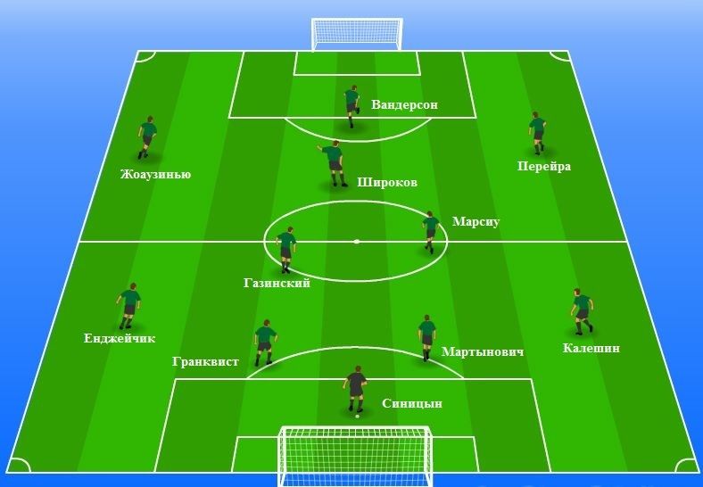 Альтернативный вариант. Его можно использовать и по ходу матча, заменив Мамаева Перейрой. Уругваец спокойно вписывается и в первую схему, только тогда Широков будет располагаться левее. Здесь же роль погрузчика передней линии отведена Перейре, а Роман перемещается в более острую позицию и утяжеляет атакующий нажим. Через него идет уже не развитие наступления, а решающая фаза. Правда, в этом случае сверхзадача ложится на плечи Енджейчика – страховать в одиночку свою треть поля, попутно осыпая польскими проклятиями еле ползущих "домой" Широкова и Жоаузинью.