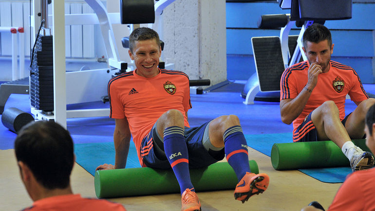 Пока Слуцкий подбадривал молодежь из армейского запаса в "квадратах" "5 на 3" и "4 на 1" репликами типа "Не разводим руками, бегаем, пока не отберем!", ключевые исполнители закончили свою пробежку и двинулись в сторону зала физиотерапии, где уже вовсю трудились Натхо, Еременко и Муса. Здесь еще примерно полчаса продолжалась работа над мышцами, суставами и связками, а Василий Березуцкий смешно шутил на английском. Даже смешнее Вернблума.