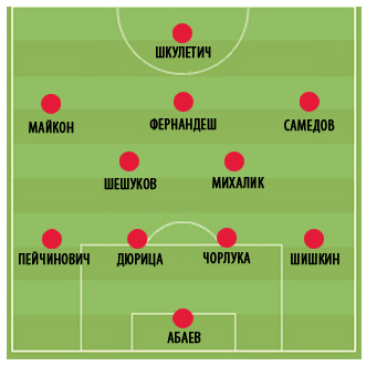 Место левого защитника неожиданно занял Пейчинович, пару опорных полузащитников составили Шешуков и Михалик, а чуть выше них расположился не Буссуфа (марокканец, как и Тарасов, остался в запасе), а Фернандеш. Случилась на левом фланге и другая неожиданность – вышел Майкон, тогда как Касаева не оказалось даже в заявке. Вместе с другим игроком основы – Денисовым.
