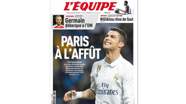 Французская L'Equipe также вышла с фотографиями Роналду на обложке. После того как "Манчестер Юнайтед" и "Бавария" объявили, что не собираются подписывать контракт с португальцем, парижский клуб стал чуть ли не единственным в Европе, кто может потянуть этот трансфер.