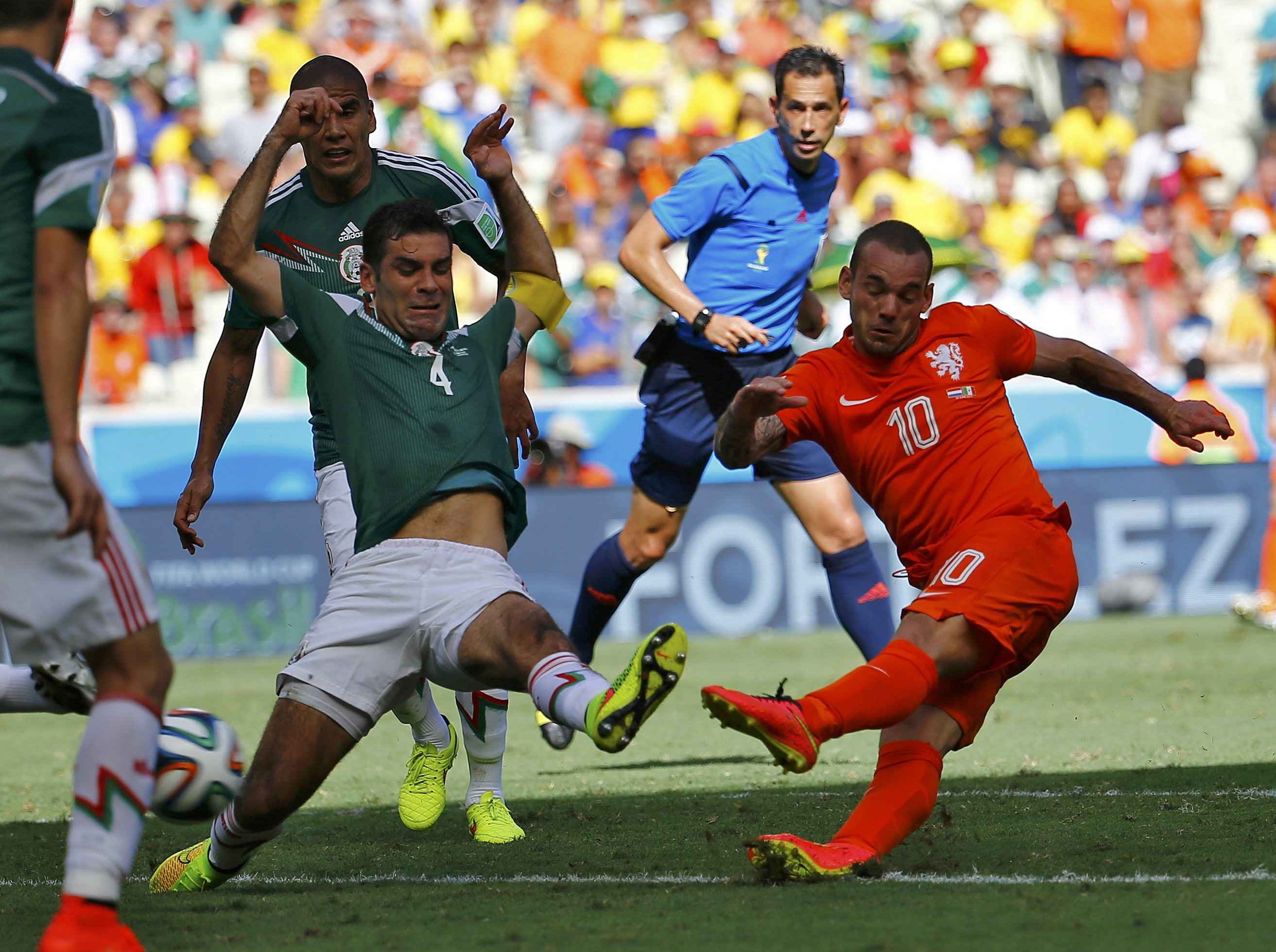 До двойного ответа под занавес ускорившиеся подопечные ван Гала имели пару дельных моментов: в первом невероятный Очоа подставил лицо и руки и отбил мяч в штангу после атаки с нескольких метров де Фрая, во втором закрыл створ от прорвавшегося под острым углом Роббена. В список опасных стоит добавить пару заходов того же форварда на пенальти. В конце первого тайма капитан мексиканцев на четырех чемпионатах Маркес в попытке заиграть свою ошибку едва не снес соперника в штрафной, а после этого ему поставил подножку Морено (в перерыве этот защитник был заменен из-за перелома голени). Вот только лишний оборот Роббена при падении, видимо, смутил судью.
