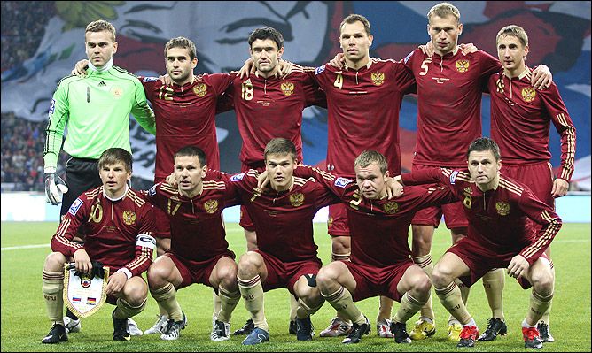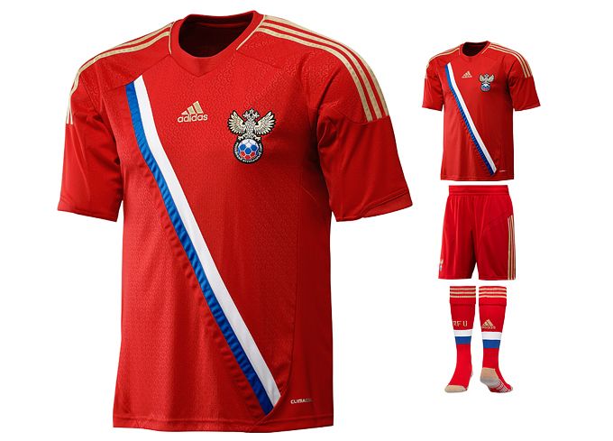 На последнем крупном турнире компания Adidas продолжила эксперименты с расположением национального флага, но при этом сохранила основные цвета комплектов: красный цвет - основной, белый – резервный. Исчезли прошлые дизайнерские решения: многочисленные звезды в районе воротника (а-ля США), большой герб на груди и претерпела изменения полоса российского флага (ниже представлен вариант 2011 года):