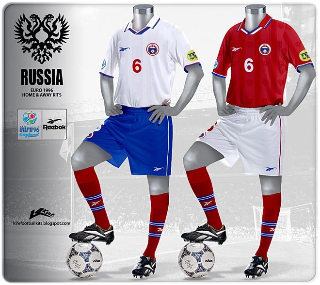 Два года спустя покорять Туманный Альбион сборная приехала в двух формах от того же производителя, который добавил в комплекты красного цвета. И если первый бело-сине-красный вариант напоминал "американский" вариант образца ЧМ-1994, то второй получился практически полностью красным, за исключением белых трусов.
