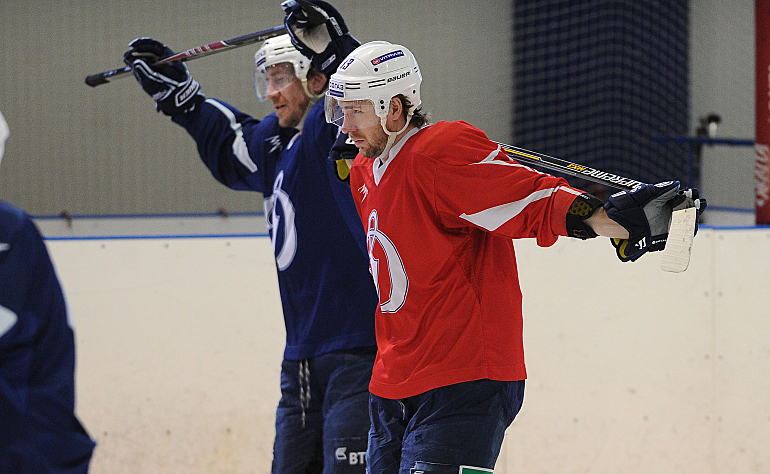 Раскусить целиком динамовскую тактику не получилось, хотя вчера журналистам впервые разрешили посмотреть почти половину тренировки. А ведь раньше только езду по кругу можно было наблюдать. Признаться, упражнения у Витолиньша интересные, нестандартные. В качестве разминочного идет "5 в 0" с выходом из своей зоны и проходом средней зоны в один пас. Примечательное упражнение шло вторым. Ворота поставили на точках вбрасывания в зонах атаки, развернули лицом к углам, и игроки отрабатывали единоборства один в один с максимально возможным количеством бросков и добиваний. Поучаствовали игроки и в эстафетах (нападающие против защитников наперегонки). А как только перешли к отработке большинства/меньшинства, всех посторонних попросили на выход.