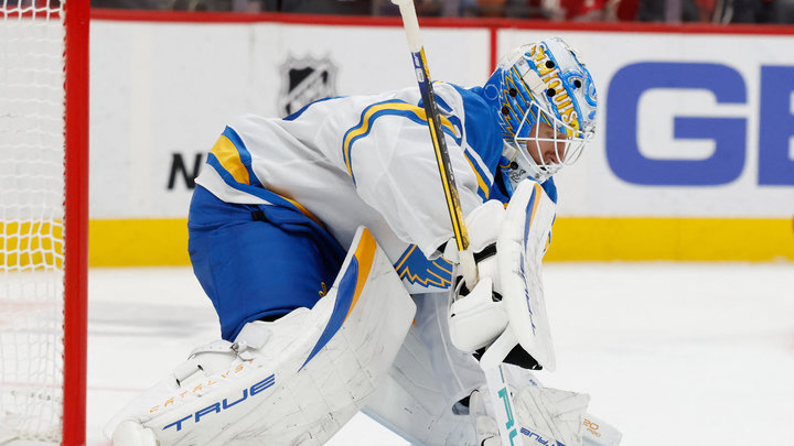 Голкипер «Сент-Луиса» Джордан Биннингтон после пропущенного гола от российского нападающего «Вашингтона» Александра Овечкина в матче регулярного чемпионата НХЛ хотел спрятать шайбу под экипировкой.
