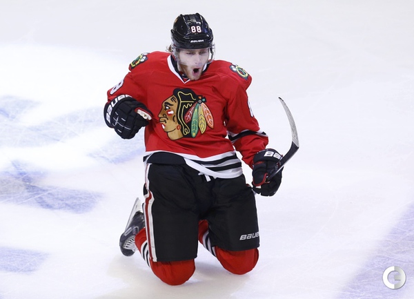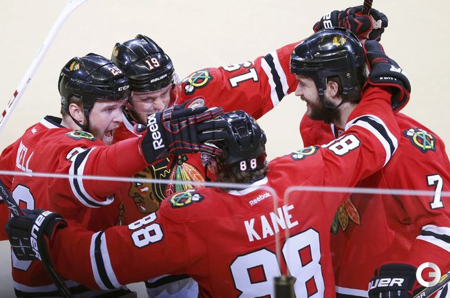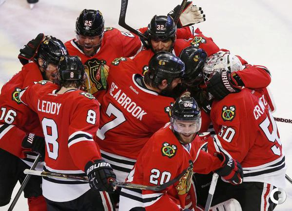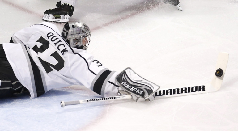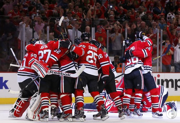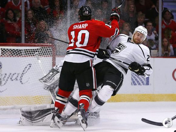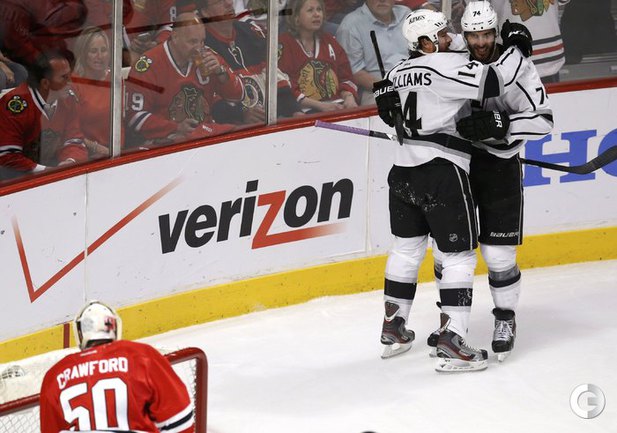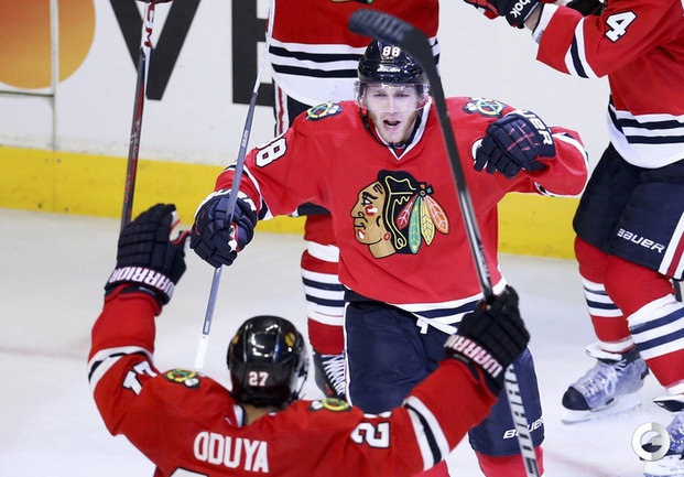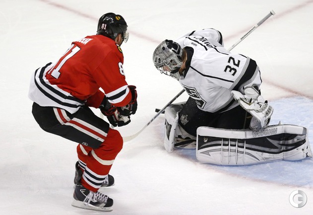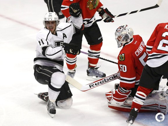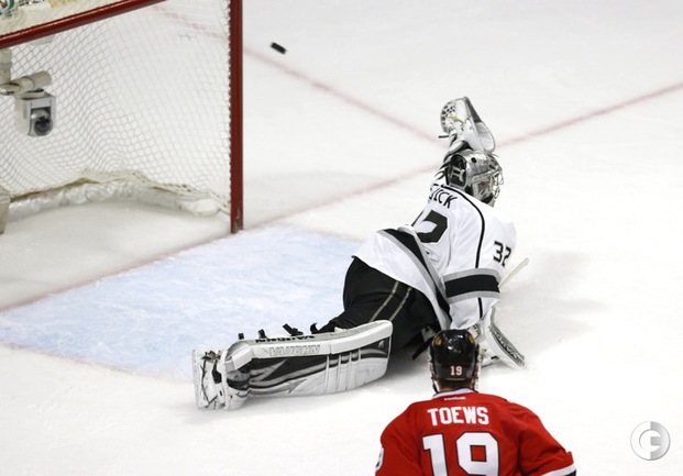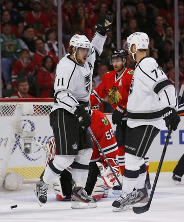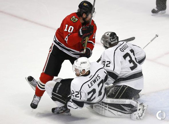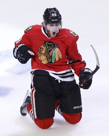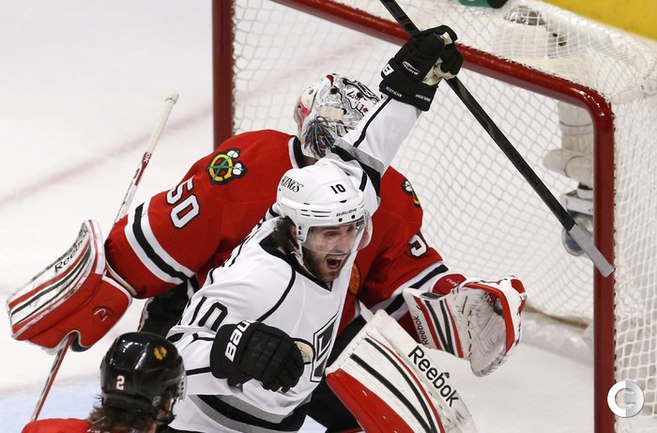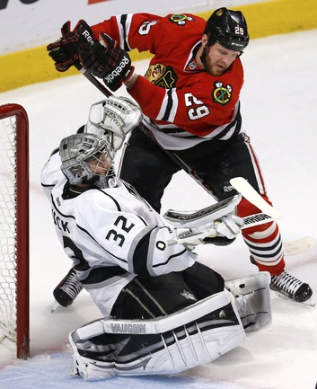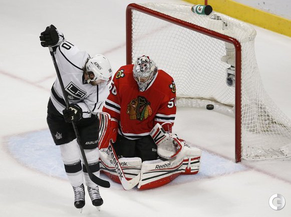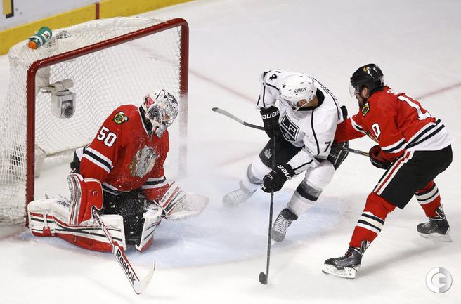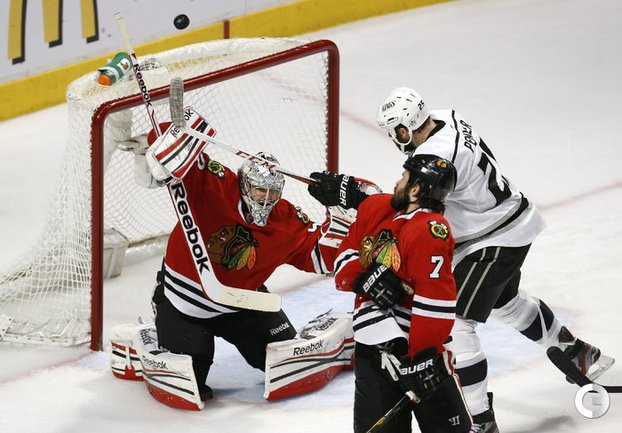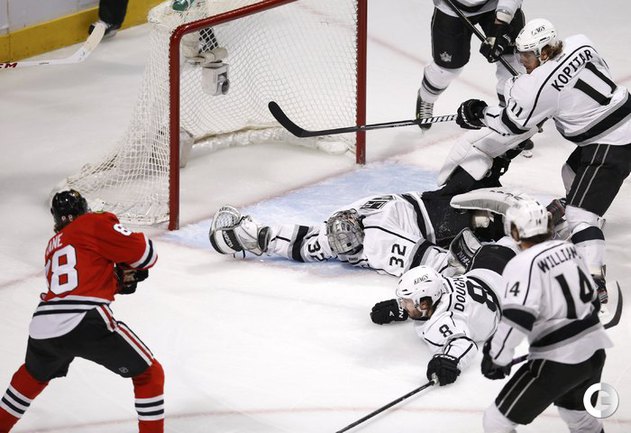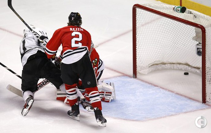 Хоккей. НХЛ. Кубок Стэнли. 1/2 финала. Пятый матч. "Чикаго" – "Лос-Анджелес" – 4:3 2ОТ (2:0, 0:1, 1:2, 0:0, 1:0). Голы: Кейт – 2 (Розсивал), 03:42 (1:0). П. Кейн – 4 (Тэйвз, Биккель), 05:59 (2:0). Д. Кинг – 2 (Дж. Уияльмс, Куик), 29:28 (2:1 – мен.). Копитар – 3 (Дж. Картер, М. Ричардс), 43:34 (2:2 – бол.). П. Кейн – 5 (Биккель), 56:08 (3:2). М. Ричардс – 3 (Копитар, ВОЙНОВ), 59:50 (3:3). П. Кейн – 6 (Тэйвз), 91:40 (4:3). В пятом матче финальной серии Западной конференции "Чикаго" на своем льду обыграл "Лос-Анджелес". Фото REUTERS