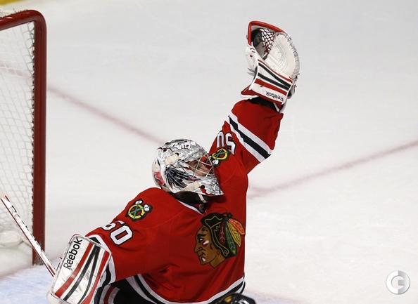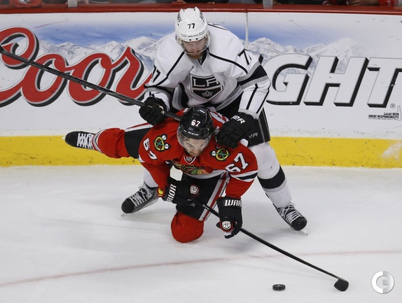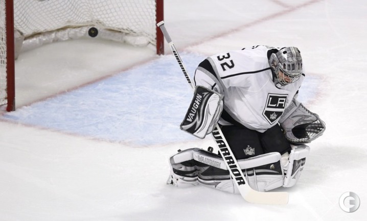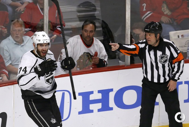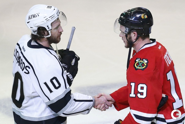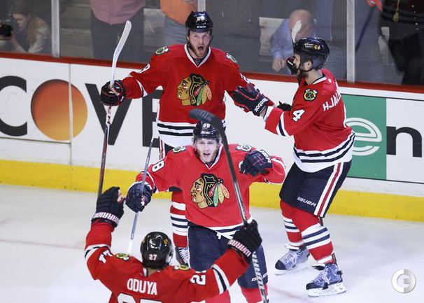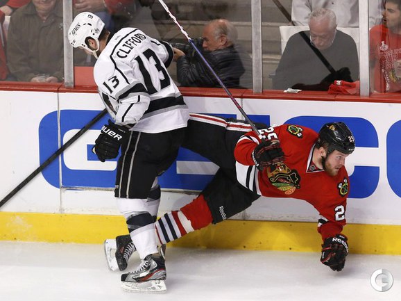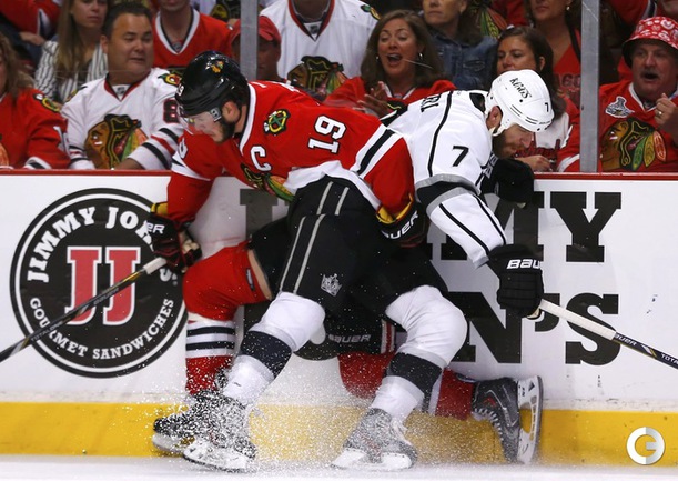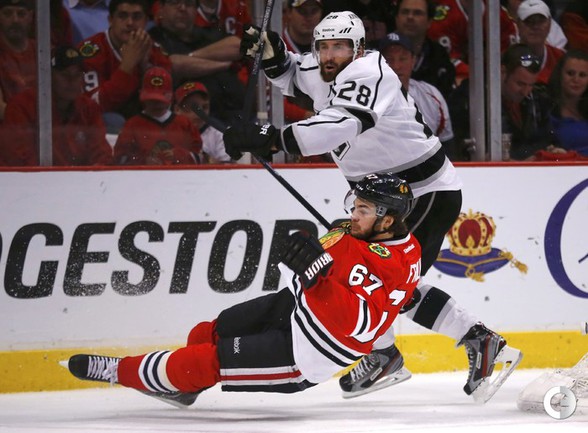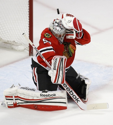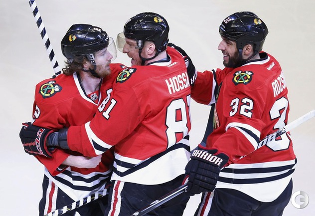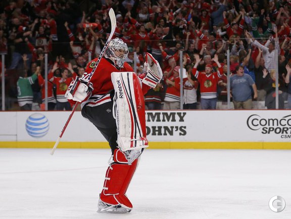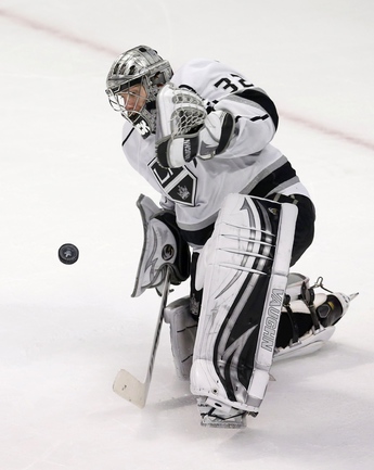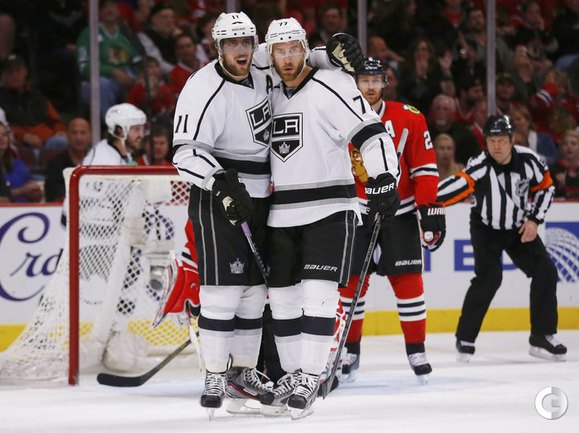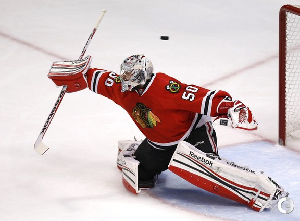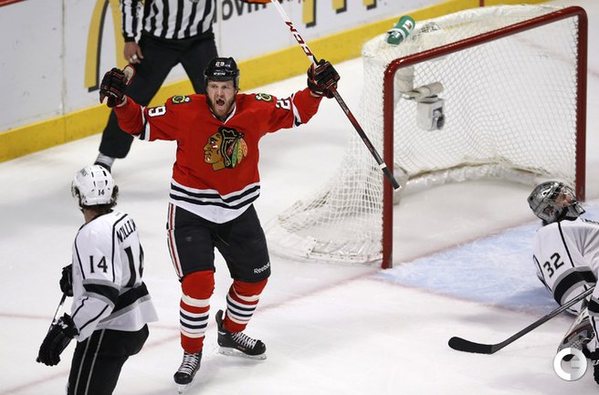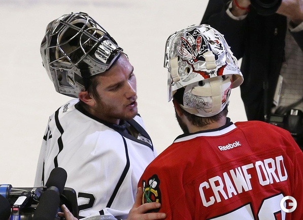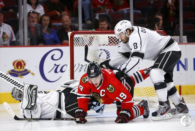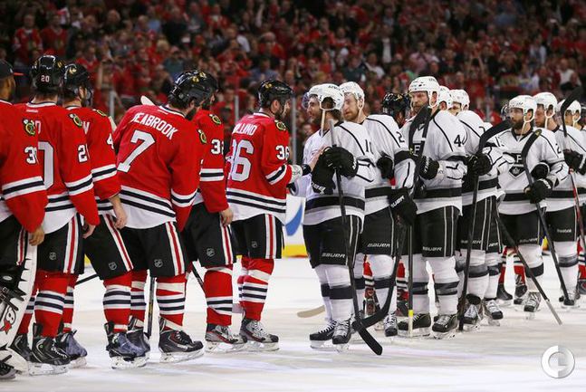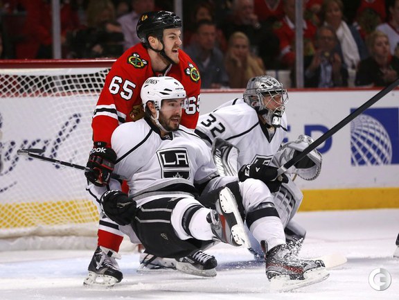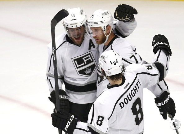 Хоккей. НХЛ. Кубок Стэнли. 1/2 финала. Пятый матч. "Чикаго" – "Лос-Анджелес" – 4:3 2ОТ (2:0, 0:1, 1:2, 0:0, 1:0). Голы: Кейт – 2 (Розсивал), 03:42 (1:0). П. Кейн – 4 (Тэйвз, Биккель), 05:59 (2:0). Д. Кинг – 2 (Дж. Уияльмс, Куик), 29:28 (2:1 – мен.). Копитар – 3 (Дж. Картер, М. Ричардс), 43:34 (2:2 – бол.). П. Кейн – 5 (Биккель), 56:08 (3:2). М. Ричардс – 3 (Копитар, ВОЙНОВ), 59:50 (3:3). П. Кейн – 6 (Тэйвз), 91:40 (4:3). В пятом матче финальной серии Западной конференции "Чикаго" на своем льду обыграл "Лос-Анджелес". Фото REUTERS