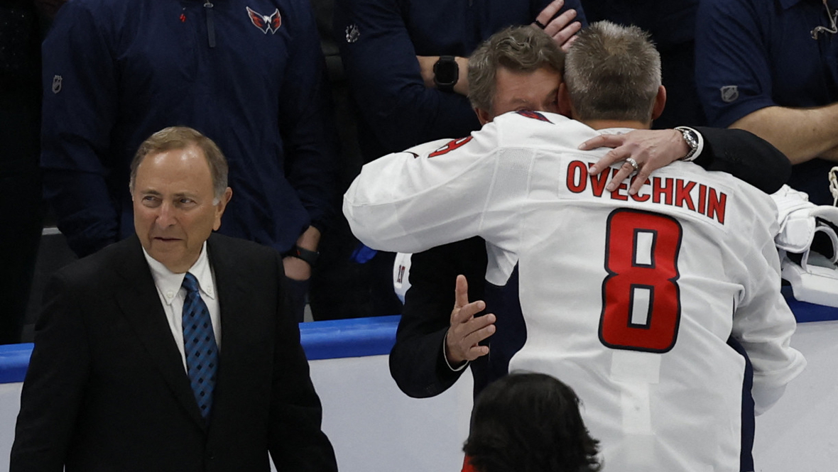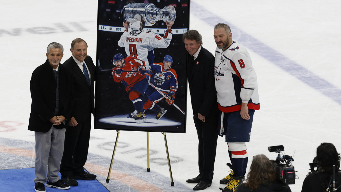 Игра была прервана для торжественной церемонии. Поздравить россиянина на лед вышли мама Татьяна Овечкина, супруга Настасия с сыновьями, владелец «Вашингтона» Тед Леонсис, руководитель НХЛ Гэри Беттмэн и сам Гретцки.